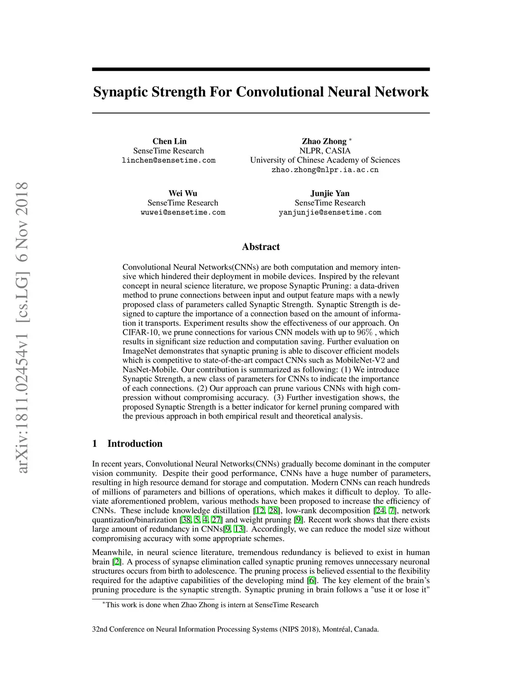 Convolutional Neural Networks(CNNs) are both computation and memory intensive which hindered their deployment in mobile devices. Inspired by the relevant concept in neural science literature, we propose Synaptic Pruning: a data-driven method to prune connections between input and output feature maps with a newly proposed class of parameters called Synaptic Strength. Synaptic Strength is designed to capture the importance of a connection based on the amount of information it transports. Experiment results show the effectiveness of our approach. On CIFAR-10, we prune connections for various CNN models with up to 96% , which results in significant size reduction and computation saving. Further evaluation on ImageNet demonstrates that synaptic pruning is able to discover efficient models which is competitive to state-of-the-art compact CNNs such as MobileNet-V2 and NasNet-Mobile. Our contribution is summarized as following: (1) We introduce Synaptic Strength, a new class of parameters for CNNs to indicate the importance of each connections. (2) Our approach can prune various CNNs with high compression without compromising accuracy. (3) Further investigation shows, the proposed Synaptic Strength is a better indicator for kernel pruning compared with the previous approach in both empirical result and theoretical analysis.