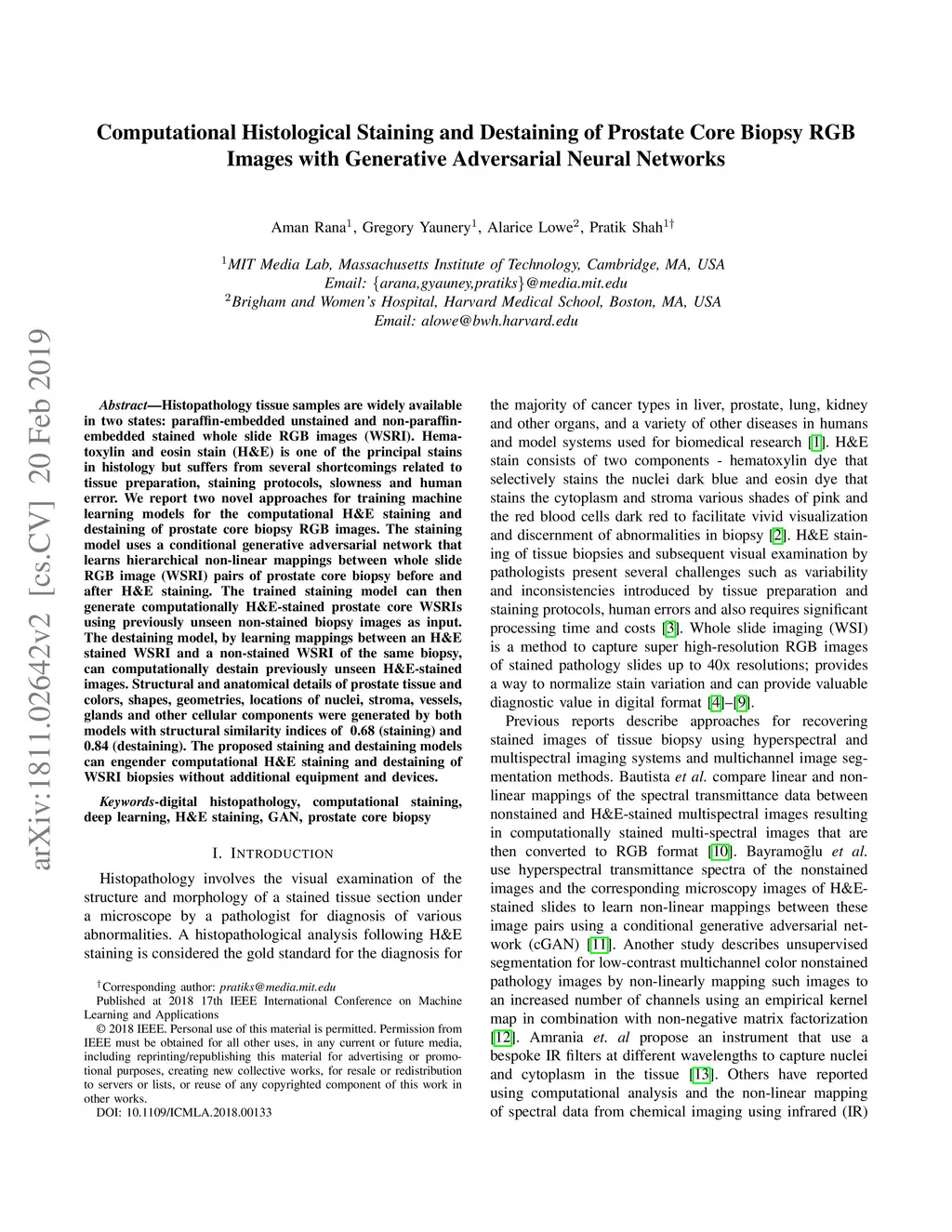 Histopathology tissue samples are widely available in two states: paraffin-embedded unstained and non-paraffin-embedded stained whole slide RGB images (WSRI). Hematoxylin and eosin stain (H&E) is one of the principal stains in histology but suffers from several shortcomings related to tissue preparation, staining protocols, slowness and human error. We report two novel approaches for training machine learning models for the computational H&E staining and destaining of prostate core biopsy RGB images. The staining model uses a conditional generative adversarial network that learns hierarchical non-linear mappings between whole slide RGB image (WSRI) pairs of prostate core biopsy before and after H&E staining. The trained staining model can then generate computationally H&E-stained prostate core WSRIs using previously unseen non-stained biopsy images as input. The destaining model, by learning mappings between an H&E stained WSRI and a non-stained WSRI of the same biopsy, can computationally destain previously unseen H&E-stained images. Structural and anatomical details of prostate tissue and colors, shapes, geometries, locations of nuclei, stroma, vessels, glands and other cellular components were generated by both models with structural similarity indices of 0.68 (staining) and 0.84 (destaining). The proposed staining and destaining models can engender computational H&E staining and destaining of WSRI biopsies without additional equipment and devices.