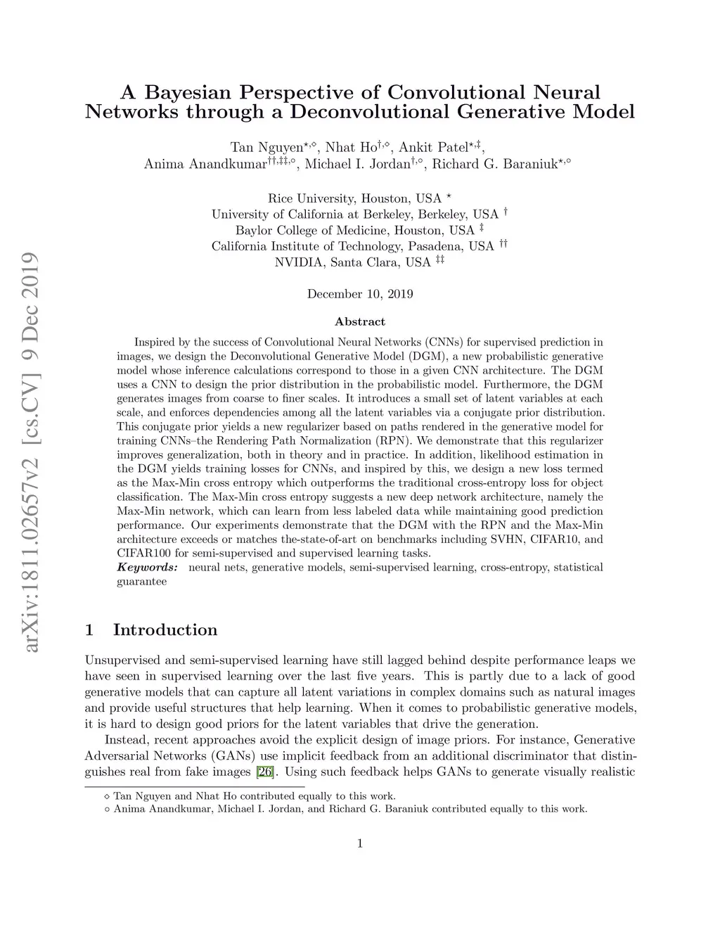 Inspired by the success of Convolutional Neural Networks (CNNs) for supervised prediction in images, we design the Deconvolutional Generative Model (DGM), a new probabilistic generative model whose inference calculations correspond to those in a given CNN architecture. The DGM uses a CNN to design the prior distribution in the probabilistic model. Furthermore, the DGM generates images from coarse to finer scales. It introduces a small set of latent variables at each scale, and enforces dependencies among all the latent variables via a conjugate prior distribution. This conjugate prior yields a new regularizer based on paths rendered in the generative model for training CNNs-the Rendering Path Normalization (RPN). We demonstrate that this regularizer improves generalization, both in theory and in practice. In addition, likelihood estimation in the DGM yields training losses for CNNs, and inspired by this, we design a new loss termed as the Max-Min cross entropy which outperforms the traditional cross-entropy loss for object classification. The Max-Min cross entropy suggests a new deep network architecture, namely the Max-Min network, which can learn from less labeled data while maintaining good prediction performance. Our experiments demonstrate that the DGM with the RPN and the Max-Min architecture exceeds or matches the-state-of-art on benchmarks including SVHN, CIFAR10, and CIFAR100 for semi-supervised and supervised learning tasks.