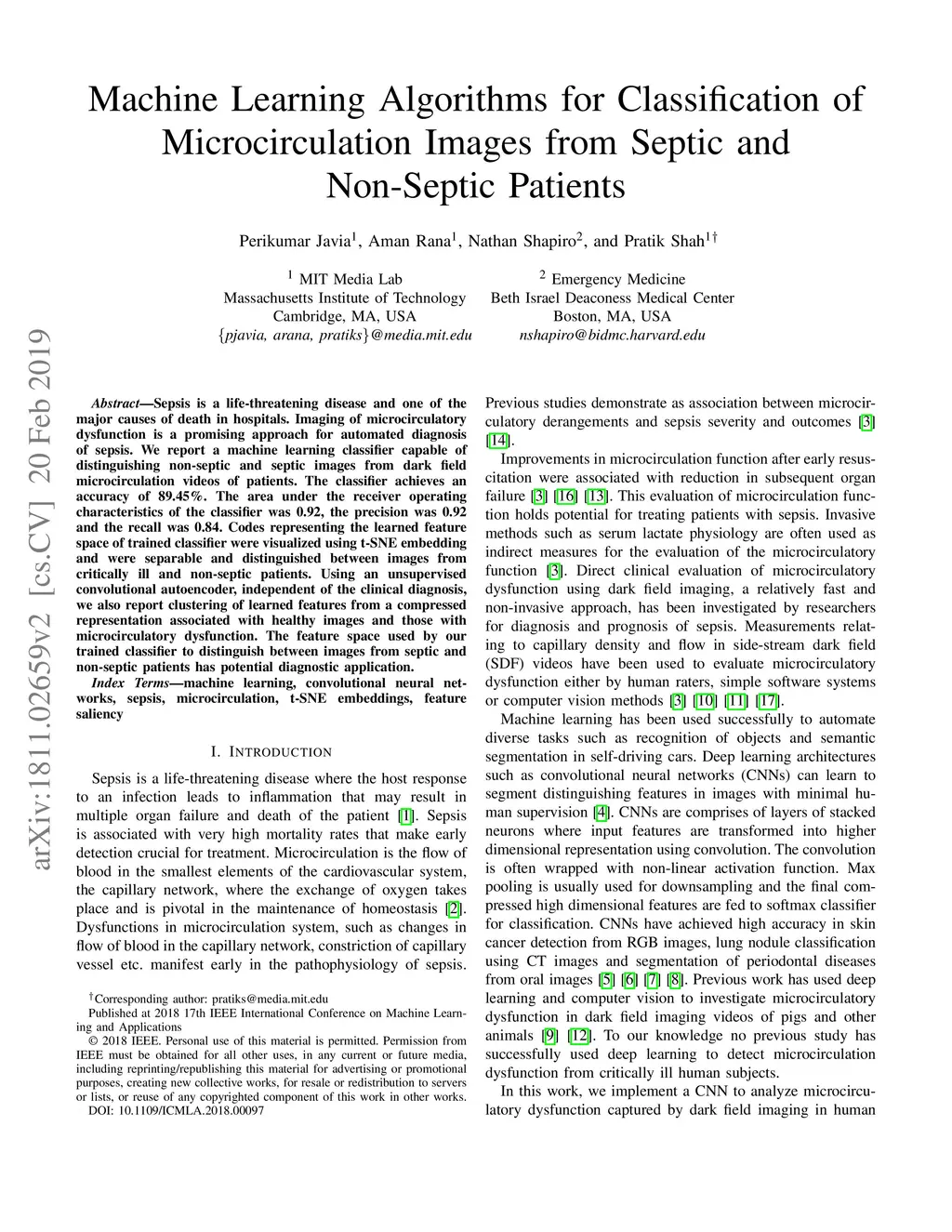 Sepsis is a life-threatening disease and one of the major causes of death in hospitals. Imaging of microcirculatory dysfunction is a promising approach for automated diagnosis of sepsis. We report a machine learning classifier capable of distinguishing non-septic and septic images from dark field microcirculation videos of patients. The classifier achieves an accuracy of 89.45%. The area under the receiver operating characteristics of the classifier was 0.92, the precision was 0.92 and the recall was 0.84. Codes representing the learned feature space of trained classifier were visualized using t-SNE embedding and were separable and distinguished between images from critically ill and non-septic patients. Using an unsupervised convolutional autoencoder, independent of the clinical diagnosis, we also report clustering of learned features from a compressed representation associated with healthy images and those with microcirculatory dysfunction. The feature space used by our trained classifier to distinguish between images from septic and non-septic patients has potential diagnostic application.