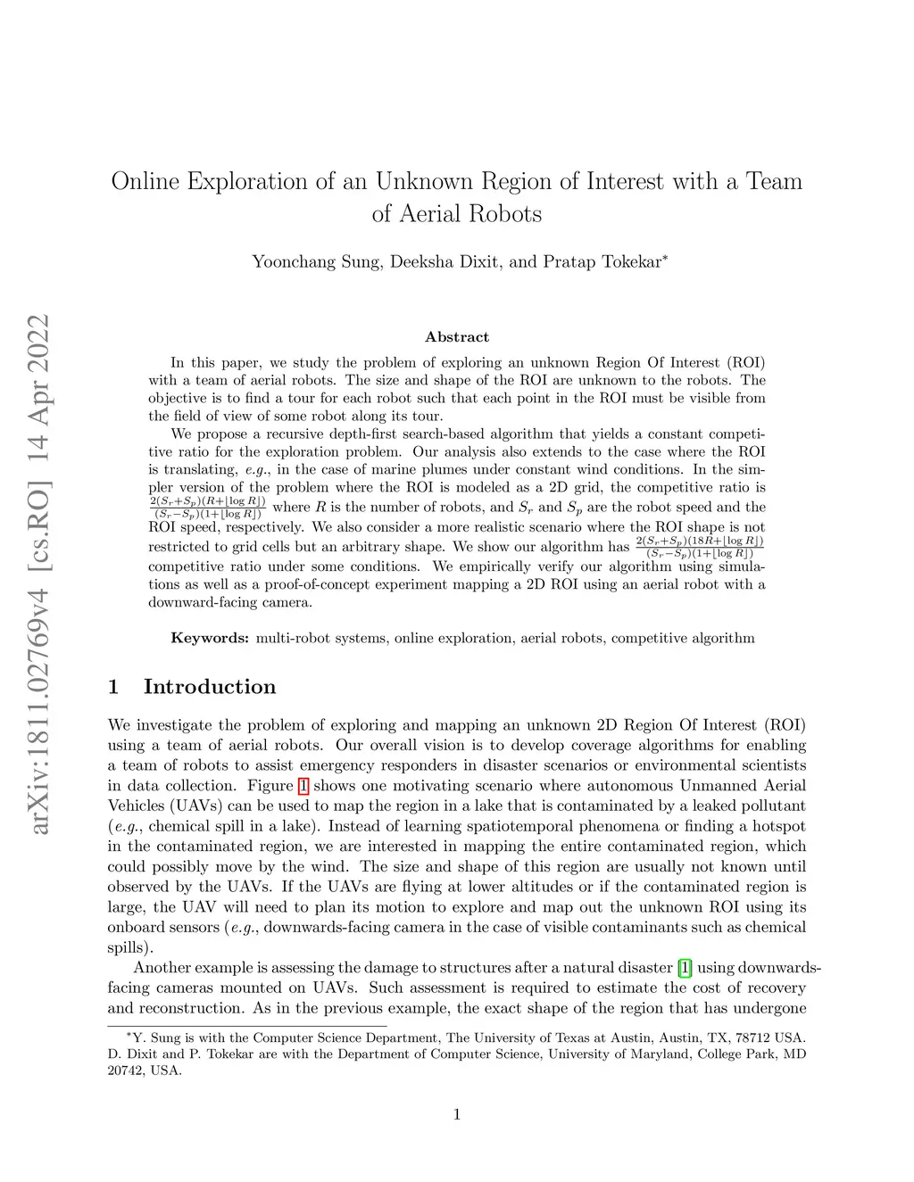 In this paper, we study the problem of exploring a translating plume with a team of aerial robots. The shape and the size of the plume are unknown to the robots. The objective is to find a tour for each robot such that they collectively explore the plume. Specifically, the tours must be such that each point in the plume must be visible from the field-of-view of some robot along its tour. We propose a recursive Depth-First Search (DFS)-based algorithm that yields a constant competitive ratio for the exploration problem. The competitive ratio is where is the number of robots, and and are the robot speed and the plume speed, respectively. We also consider a more realistic scenario where the plume shape is not restricted to grid cells but an arbitrary shape. We show our algorithm has competitive ratio under the fat condition. We empirically verify our algorithm using simulations.