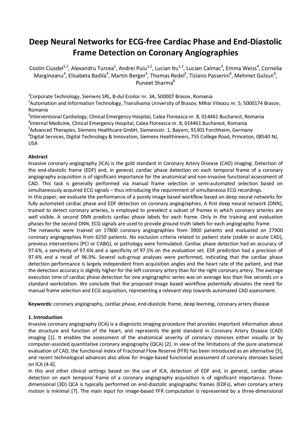 Invasive coronary angiography (ICA) is the gold standard in Coronary Artery Disease (CAD) imaging. Detection of the end-diastolic frame (EDF) and, in general, cardiac phase detection on each temporal frame of a coronary angiography acquisition is of significant importance for the anatomical and non-invasive functional assessment of CAD. This task is generally performed via manual frame selection or semi-automated selection based on simultaneously acquired ECG signals - thus introducing the requirement of simultaneous ECG recordings. We evaluate the performance of a purely image based workflow based on deep neural networks for fully automated cardiac phase and EDF detection on coronary angiographies. A first deep neural network (DNN), trained to detect coronary arteries, is employed to preselect a subset of frames in which coronary arteries are well visible. A second DNN predicts cardiac phase labels for each frame. Only in the training and evaluation phases for the second DNN, ECG signals are used to provide ground truth labels for each angiographic frame. The networks were trained on 17800 coronary angiographies from 3900 patients and evaluated on 27900 coronary angiographies from 6250 patients. No exclusion criteria related to patient state, previous interventions, or pathology were formulated. Cardiac phase detection had an accuracy of 97.6%, a sensitivity of 97.6% and a specificity of 97.5% on the evaluation set. EDF prediction had a precision of 97.4% and a recall of 96.9%. Several sub-group analyses were performed, indicating that the cardiac phase detection performance is largely independent from acquisition angles and the heart rate of the patient. The average execution time of cardiac phase detection for one angiographic series was on average less than five seconds on a standard workstation.