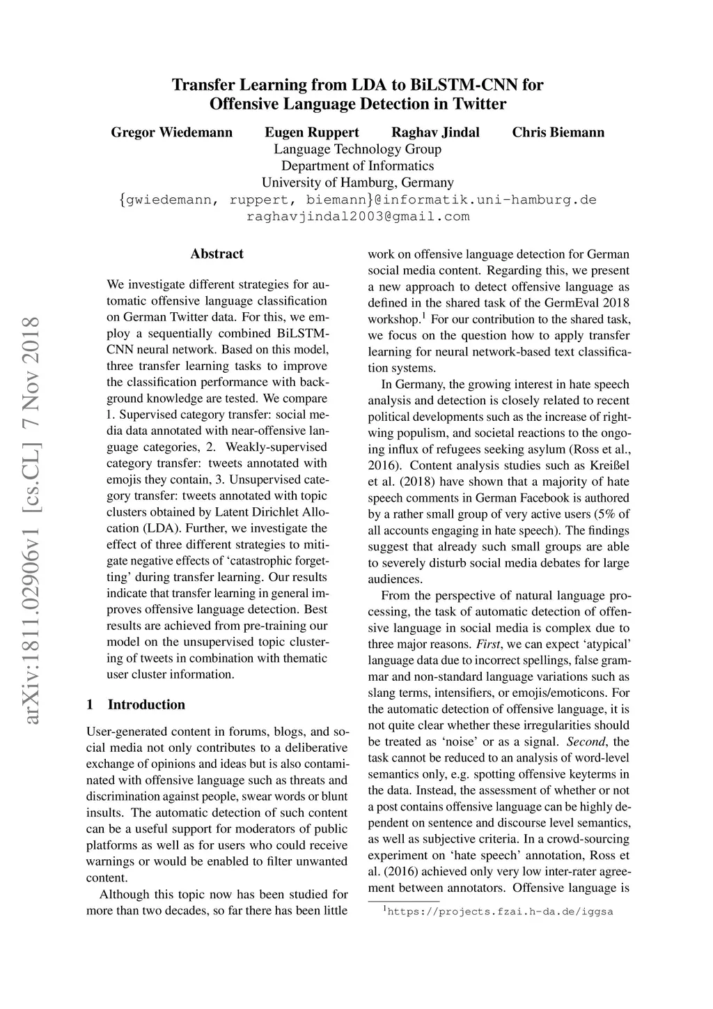 Transfer Learning from LDA to BiLSTM-CNN for Offensive Language