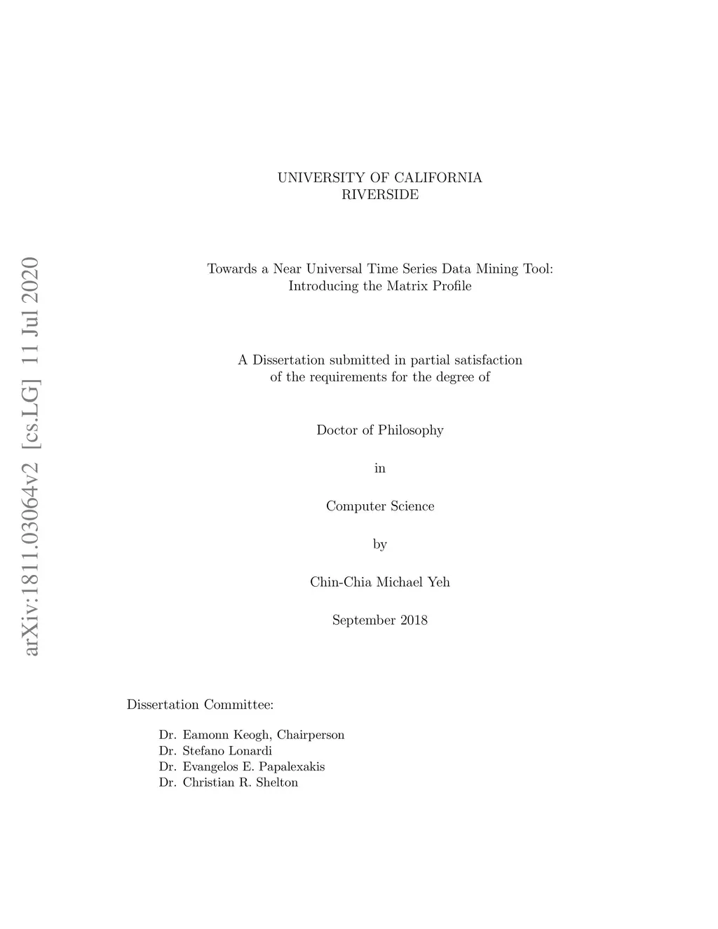 The last decade has seen a flurry of research on all-pairs-similarity-search (or, self-join) for text, DNA, and a handful of other datatypes, and these systems have been applied to many diverse data mining problems. Surprisingly, however, little progress has been made on addressing this problem for time series subsequences. In this thesis, we have introduced a near universal time series data mining tool called matrix profile which solves the all-pairs-similarity-search problem and caches the output in an easy-to-access fashion. The proposed algorithm is not only parameter-free, exact and scalable, but also applicable for both single and multidimensional time series. By building time series data mining methods on top of matrix profile, many time series data mining tasks (e.g., motif discovery, discord discovery, shapelet discovery, semantic segmentation, and clustering) can be efficiently solved. Because the same matrix profile can be shared by a diverse set of time series data mining methods, matrix profile is versatile and computed-once-use-many-times data structure. We demonstrate the utility of matrix profile for many time series data mining problems, including motif discovery, discord discovery, weakly labeled time series classification, and representation learning on domains as diverse as seismology, entomology, music processing, bioinformatics, human activity monitoring, electrical power-demand monitoring, and medicine. We hope the matrix profile is not the end but the beginning of many more time series data mining projects.