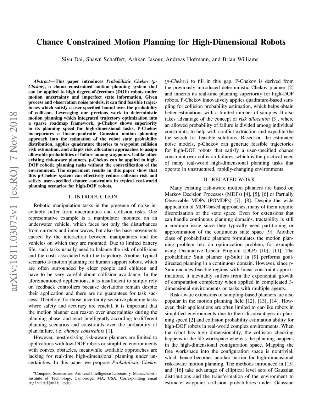 This paper introduces Probabilistic Chekov (p-Chekov), a chance-constrained motion planning system that can be applied to high degree-of-freedom (DOF) robots under motion uncertainty and imperfect state information. Given process and observation noise models, it can find feasible trajectories which satisfy a user-specified bound over the probability of collision. Leveraging our previous work in deterministic motion planning which integrated trajectory optimization into a sparse roadmap framework, p-Chekov shows superiority in its planning speed for high-dimensional tasks. P-Chekov incorporates a linear-quadratic Gaussian motion planning approach into the estimation of the robot state probability distribution, applies quadrature theories to waypoint collision risk estimation, and adapts risk allocation approaches to assign allowable probabilities of failure among waypoints. Unlike other existing risk-aware planners, p-Chekov can be applied to high-DOF robotic planning tasks without the convexification of the environment. The experiment results in this paper show that this p-Chekov system can effectively reduce collision risk and satisfy user-specified chance constraints in typical real-world planning scenarios for high-DOF robots.