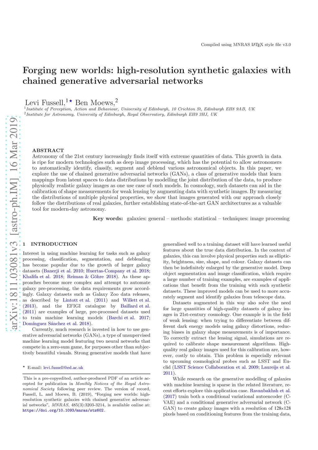 Astronomy of the 21st century increasingly finds itself with extreme quantities of data. This growth in data is ripe for modern technologies such as deep image processing, which has the potential to allow astronomers to automatically identify, classify, segment and deblend various astronomical objects. In this paper, we explore the use of chained generative adversarial networks (GANs), a class of generative models that learn mappings from latent spaces to data distributions by modelling the joint distribution of the data, to produce physically realistic galaxy images as one use case of such models. In cosmology, such datasets can aid in the calibration of shape measurements for weak lensing by augmenting data with synthetic images. By measuring the distributions of multiple physical properties, we show that images generated with our approach closely follow the distributions of real galaxies, further establishing state-of-the-art GAN architectures as a valuable tool for modern-day astronomy.