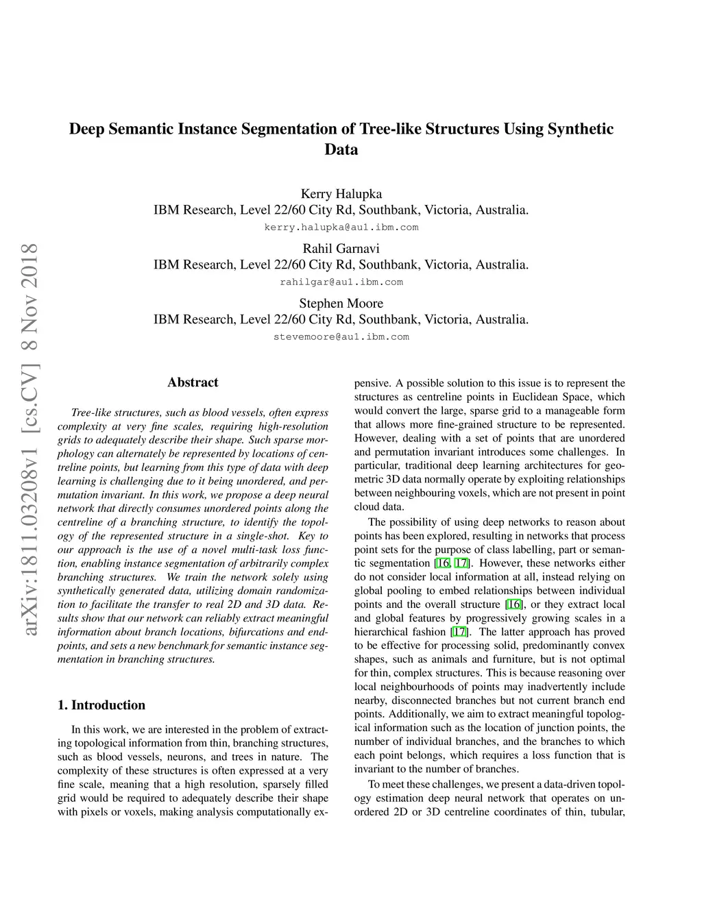 Tree-like structures, such as blood vessels, often express complexity at very fine scales, requiring high-resolution grids to adequately describe their shape. Such sparse morphology can alternately be represented by locations of centreline points, but learning from this type of data with deep learning is challenging due to it being unordered, and permutation invariant. In this work, we propose a deep neural network that directly consumes unordered points along the centreline of a branching structure, to identify the topology of the represented structure in a single-shot. Key to our approach is the use of a novel multi-task loss function, enabling instance segmentation of arbitrarily complex branching structures. We train the network solely using synthetically generated data, utilizing domain randomization to facilitate the transfer to real 2D and 3D data. Results show that our network can reliably extract meaningful information about branch locations, bifurcations and endpoints, and sets a new benchmark for semantic instance segmentation in branching structures.