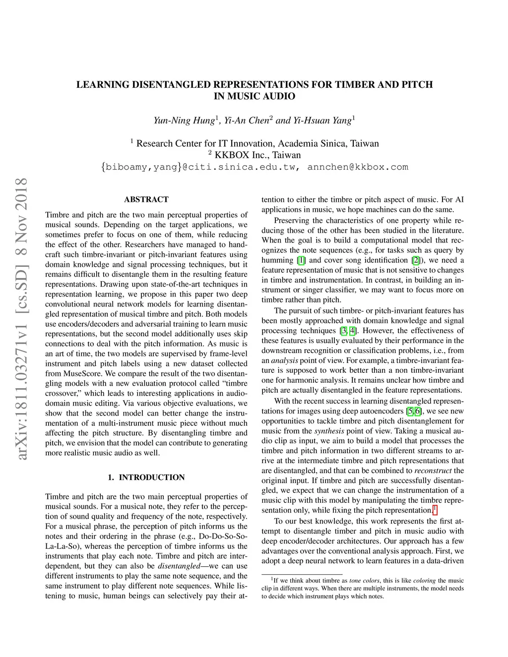 Timbre and pitch are the two main perceptual properties of musical sounds. Depending on the target applications, we sometimes prefer to focus on one of them, while reducing the effect of the other. Researchers have managed to hand-craft such timbre-invariant or pitch-invariant features using domain knowledge and signal processing techniques, but it remains difficult to disentangle them in the resulting feature representations. Drawing upon state-of-the-art techniques in representation learning, we propose in this paper two deep convolutional neural network models for learning disentangled representation of musical timbre and pitch. Both models use encoders/decoders and adversarial training to learn music representations, but the second model additionally uses skip connections to deal with the pitch information. As music is an art of time, the two models are supervised by frame-level instrument and pitch labels using a new dataset collected from MuseScore. We compare the result of the two disentangling models with a new evaluation protocol called "timbre crossover", which leads to interesting applications in audio-domain music editing. Via various objective evaluations, we show that the second model can better change the instrumentation of a multi-instrument music piece without much affecting the pitch structure. By disentangling timbre and pitch, we envision that the model can contribute to generating more realistic music audio as well.