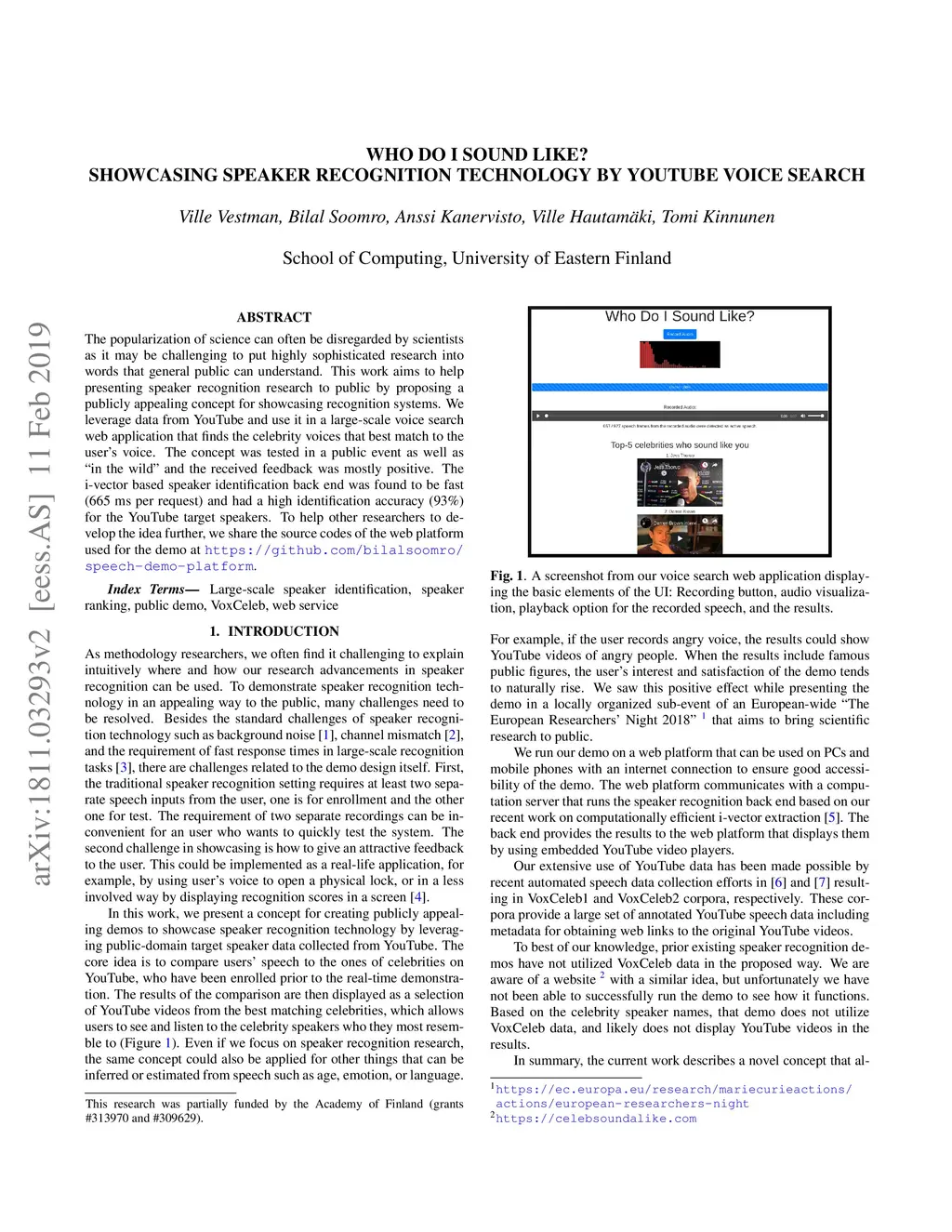 The popularization of science can often be disregarded by scientists as it may be challenging to put highly sophisticated research into words that general public can understand. This work aims to help presenting speaker recognition research to public by proposing a publicly appealing concept for showcasing recognition systems. We leverage data from YouTube and use it in a large-scale voice search web application that finds the celebrity voices that best match to the user's voice. The concept was tested in a public event as well as "in the wild" and the received feedback was mostly positive. The i-vector based speaker identification back end was found to be fast (665 ms per request) and had a high identification accuracy (93 %) for the YouTube target speakers. To help other researchers to develop the idea further, we share the source codes of the web platform used for the demo at https://github.com/bilalsoomro/speech-demo-platform.