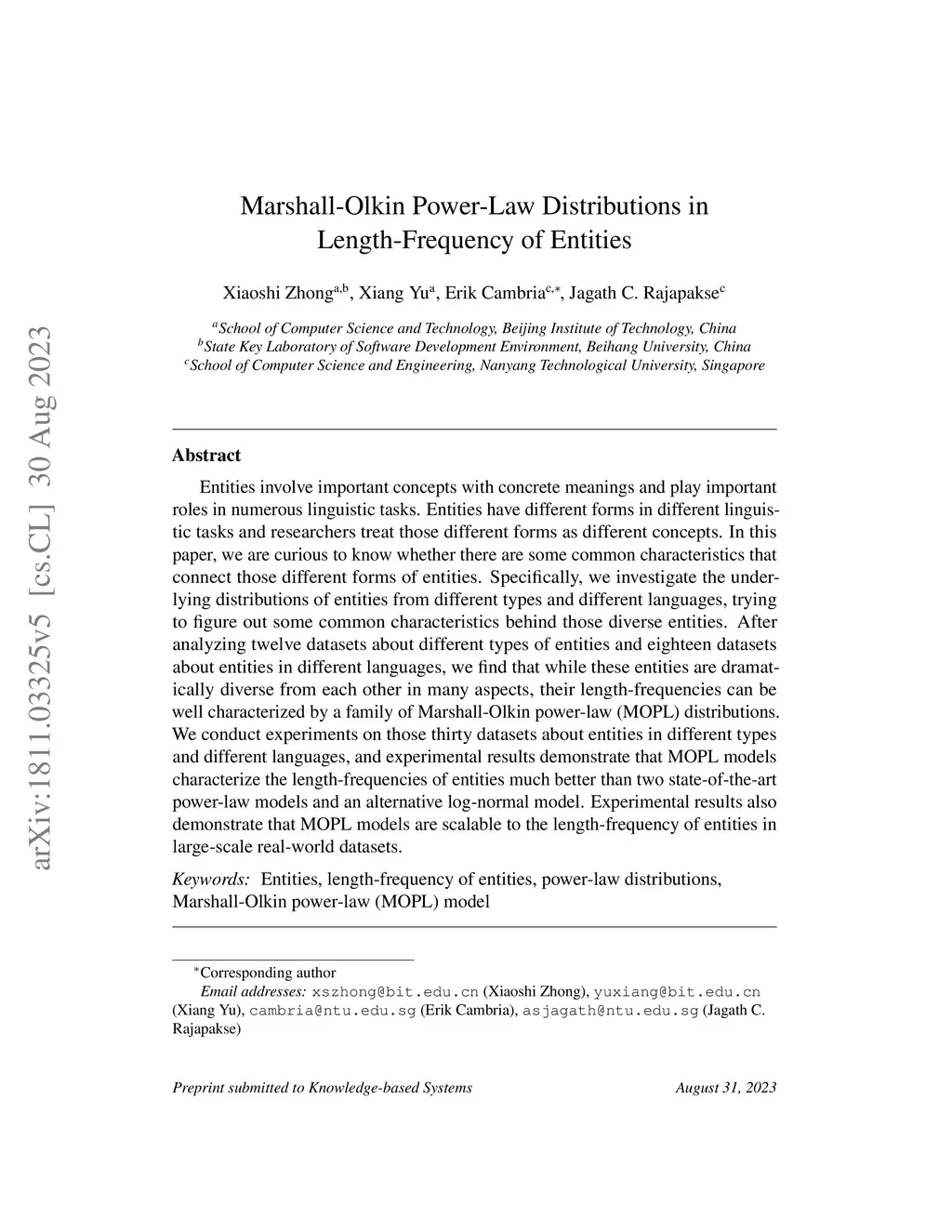 This paper presents a discovery that the length of the entities follows a family of scale-free power law distributions. The concept of entity here broadly includes the named entity, entity mention, time expression, and domain-specific entity that are well investigated in natural language processing and related areas. The power law distributions in entity length possess the scale-free property and have well-defined means and finite variances. We explain the phenomenon of power laws in entity length by the principle of least effort in communication and the preferential mechanism.