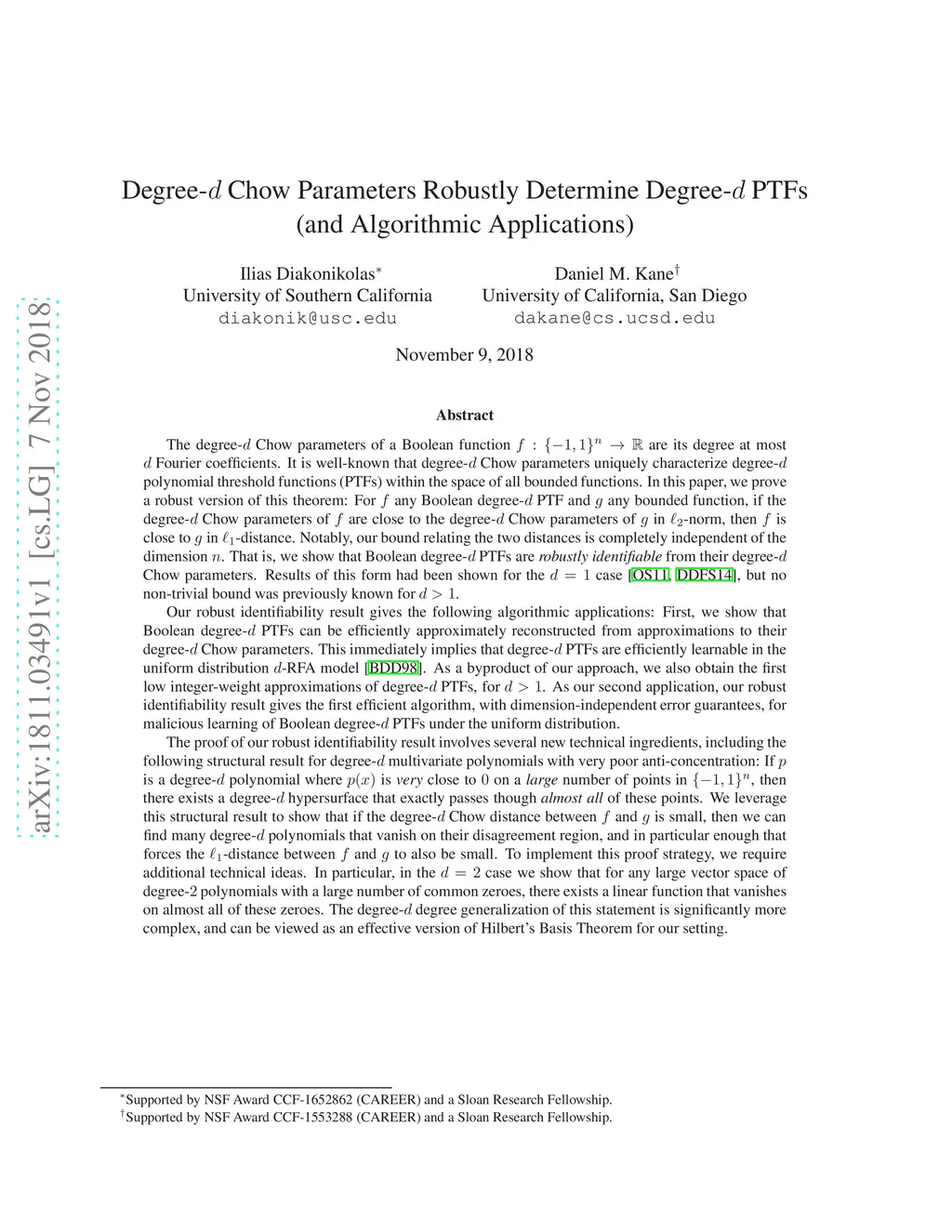 The degree- Chow parameters of a Boolean function are its degree at most Fourier coefficients. It is well-known that degree- Chow parameters uniquely characterize degree- polynomial threshold functions (PTFs) within the space of all bounded functions. In this paper, we prove a robust version of this theorem: For any Boolean degree- PTF and any bounded function, if the degree- Chow parameters of are close to the degree- Chow parameters of in -norm, then is close to in -distance. Notably, our bound relating the two distances is completely independent of the dimension . That is, we show that Boolean degree- PTFs are {\em robustly identifiable} from their degree- Chow parameters. Results of this form had been shown for the case~\cite{OS11:chow, DeDFS14}, but no non-trivial bound was previously known for . Our robust identifiability result gives the following algorithmic applications: First, we show that Boolean degree- PTFs can be efficiently approximately reconstructed from approximations to their degree- Chow parameters. This immediately implies that degree- PTFs are efficiently learnable in the uniform distribution -RFA model~\cite{BenDavidDichterman:98}. As a byproduct of our approach, we also obtain the first low integer-weight approximations of degree- PTFs, for . As our second application, our robust identifiability result gives the first efficient algorithm, with dimension-independent error guarantees, for malicious learning of Boolean degree- PTFs under the uniform distribution.