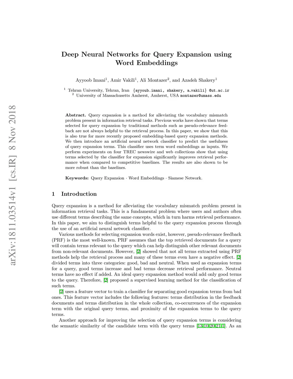 Deep Neural Networks for Query Expansion using Word Embeddings