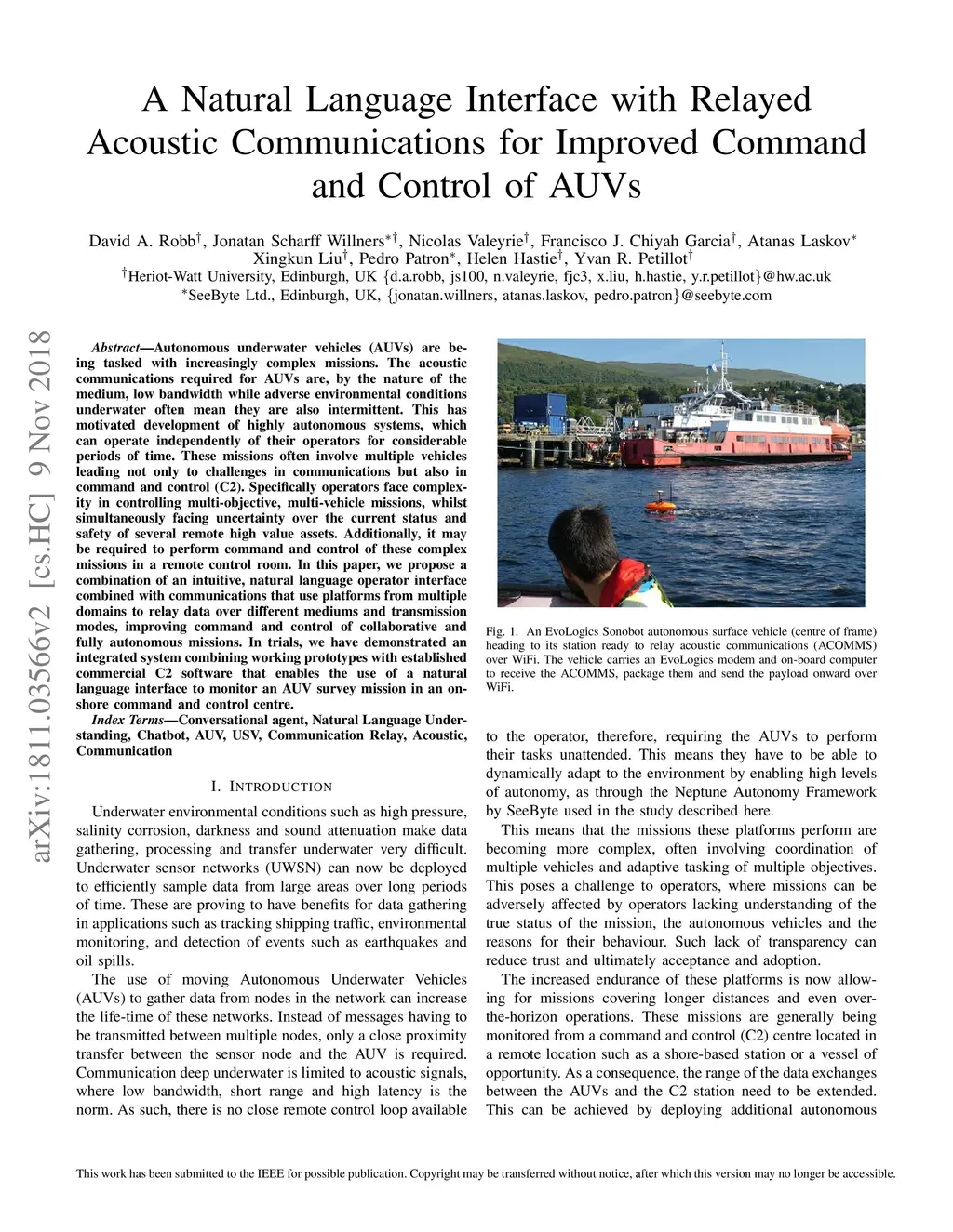 Autonomous underwater vehicles (AUVs) are being tasked with increasingly complex missions. The acoustic communications required for AUVs are, by the nature of the medium, low bandwidth while adverse environmental conditions underwater often mean they are also intermittent. This has motivated development of highly autonomous systems, which can operate independently of their operators for considerable periods of time. These missions often involve multiple vehicles leading not only to challenges in communications but also in command and control (C2). Specifically operators face complexity in controlling multi-objective, multi-vehicle missions, whilst simultaneously facing uncertainty over the current status and safety of several remote high value assets. Additionally, it may be required to perform command and control of these complex missions in a remote control room. In this paper, we propose a combination of an intuitive, natural language operator interface combined with communications that use platforms from multiple domains to relay data over different mediums and transmission modes, improving command and control of collaborative and fully autonomous missions. In trials, we have demonstrated an integrated system combining working prototypes with established commercial C2 software that enables the use of a natural language interface to monitor an AUV survey mission in an on-shore command and control centre.