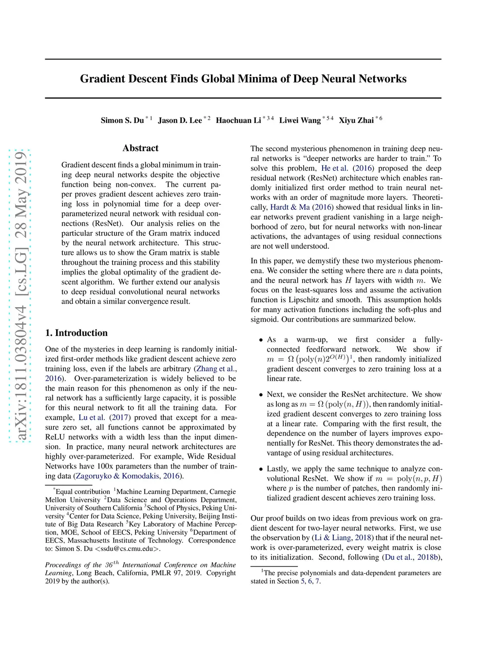 Gradient descent finds a global minimum in training deep neural networks despite the objective function being non-convex. The current paper proves gradient descent achieves zero training loss in polynomial time for a deep over-parameterized neural network with residual connections (ResNet). Our analysis relies on the particular structure of the Gram matrix induced by the neural network architecture. This structure allows us to show the Gram matrix is stable throughout the training process and this stability implies the global optimality of the gradient descent algorithm. We further extend our analysis to deep residual convolutional neural networks and obtain a similar convergence result.
