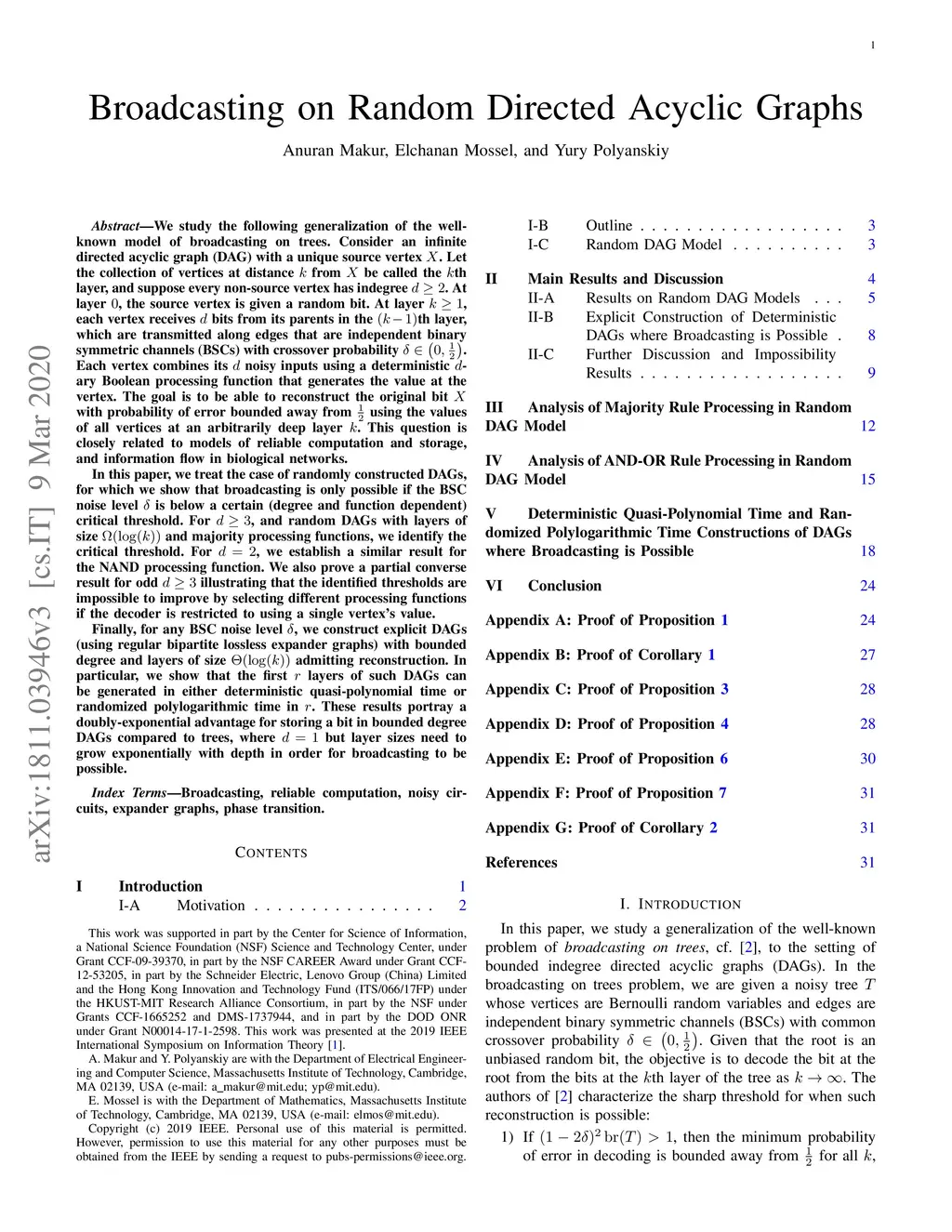 We study a generalization of the well-known model of broadcasting on trees. Consider a directed acyclic graph (DAG) with a unique source vertex , and suppose all other vertices have indegree . Let the vertices at distance from be called layer . At layer , is given a random bit. At layer , each vertex receives bits from its parents in layer , which are transmitted along independent binary symmetric channel edges, and combines them using a -ary Boolean processing function. The goal is to reconstruct with probability of error bounded away from using the values of all vertices at an arbitrarily deep layer. This question is closely related to models of reliable computation and storage, and information flow in biological networks. In this paper, we analyze randomly constructed DAGs, for which we show that broadcasting is only possible if the noise level is below a certain degree and function dependent critical threshold. For , and random DAGs with layer sizes and majority processing functions, we identify the critical threshold. For , we establish a similar result for NAND processing functions. We also prove a partial converse for odd illustrating that the identified thresholds are impossible to improve by selecting different processing functions if the decoder is restricted to using a single vertex. Finally, for any noise level, we construct explicit DAGs (using expander graphs) with bounded degree and layer sizes admitting reconstruction. In particular, we show that such DAGs can be generated in deterministic quasi-polynomial time or randomized polylogarithmic time in the depth. These results portray a doubly-exponential advantage for storing a bit in DAGs compared to trees, where but layer sizes must grow exponentially with depth in order to enable broadcasting.