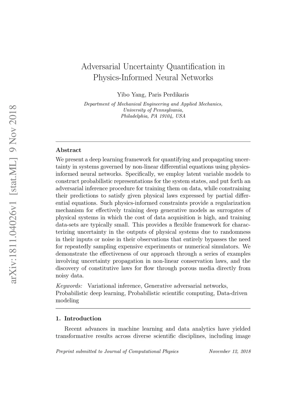 We present a deep learning framework for quantifying and propagating uncertainty in systems governed by non-linear differential equations using physics-informed neural networks. Specifically, we employ latent variable models to construct probabilistic representations for the system states, and put forth an adversarial inference procedure for training them on data, while constraining their predictions to satisfy given physical laws expressed by partial differential equations. Such physics-informed constraints provide a regularization mechanism for effectively training deep generative models as surrogates of physical systems in which the cost of data acquisition is high, and training data-sets are typically small. This provides a flexible framework for characterizing uncertainty in the outputs of physical systems due to randomness in their inputs or noise in their observations that entirely bypasses the need for repeatedly sampling expensive experiments or numerical simulators. We demonstrate the effectiveness of our approach through a series of examples involving uncertainty propagation in non-linear conservation laws, and the discovery of constitutive laws for flow through porous media directly from noisy data.