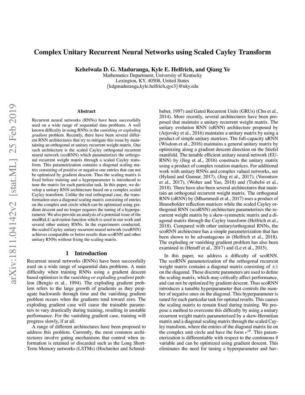 Complex Unitary Recurrent Neural Networks using Scaled Cayley Transform