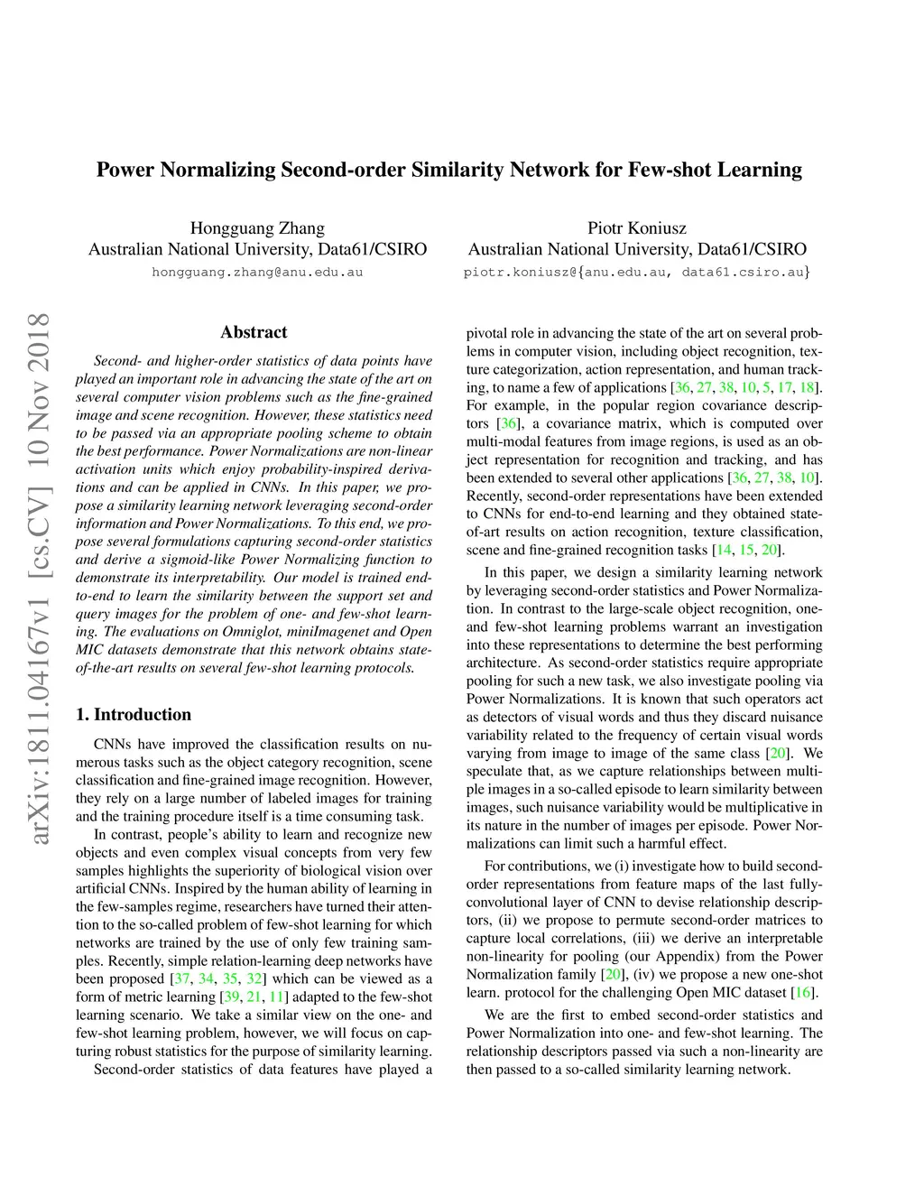 Second- and higher-order statistics of data points have played an important role in advancing the state of the art on several computer vision problems such as the fine-grained image and scene recognition. However, these statistics need to be passed via an appropriate pooling scheme to obtain the best performance. Power Normalizations are non-linear activation units which enjoy probability-inspired derivations and can be applied in CNNs. In this paper, we propose a similarity learning network leveraging second-order information and Power Normalizations. To this end, we propose several formulations capturing second-order statistics and derive a sigmoid-like Power Normalizing function to demonstrate its interpretability. Our model is trained end-to-end to learn the similarity between the support set and query images for the problem of one- and few-shot learning. The evaluations on Omniglot, miniImagenet and Open MIC datasets demonstrate that this network obtains state-of-the-art results on several few-shot learning protocols.