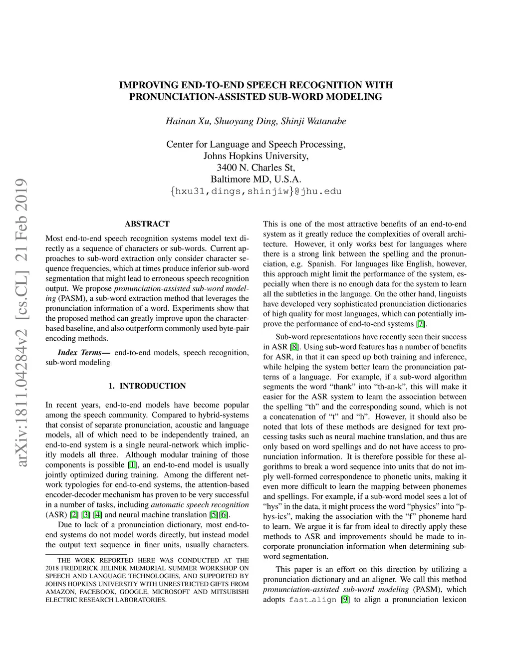 Most end-to-end speech recognition systems model text directly as a sequence of characters or sub-words. Current approaches to sub-word extraction only consider character sequence frequencies, which at times produce inferior sub-word segmentation that might lead to erroneous speech recognition output. We propose pronunciation-assisted sub-word modeling (PASM), a sub-word extraction method that leverages the pronunciation information of a word. Experiments show that the proposed method can greatly improve upon the character-based baseline, and also outperform commonly used byte-pair encoding methods.