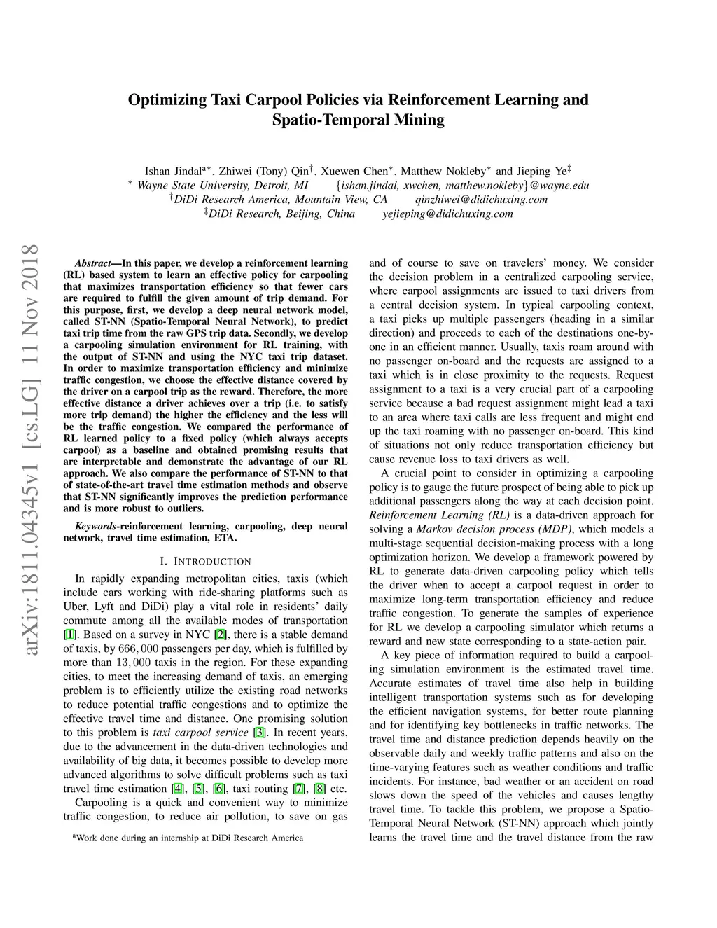 In this paper, we develop a reinforcement learning (RL) based system to learn an effective policy for carpooling that maximizes transportation efficiency so that fewer cars are required to fulfill the given amount of trip demand. For this purpose, first, we develop a deep neural network model, called ST-NN (Spatio-Temporal Neural Network), to predict taxi trip time from the raw GPS trip data. Secondly, we develop a carpooling simulation environment for RL training, with the output of ST-NN and using the NYC taxi trip dataset. In order to maximize transportation efficiency and minimize traffic congestion, we choose the effective distance covered by the driver on a carpool trip as the reward. Therefore, the more effective distance a driver achieves over a trip (i.e. to satisfy more trip demand) the higher the efficiency and the less will be the traffic congestion. We compared the performance of RL learned policy to a fixed policy (which always accepts carpool) as a baseline and obtained promising results that are interpretable and demonstrate the advantage of our RL approach. We also compare the performance of ST-NN to that of state-of-the-art travel time estimation methods and observe that ST-NN significantly improves the prediction performance and is more robust to outliers.