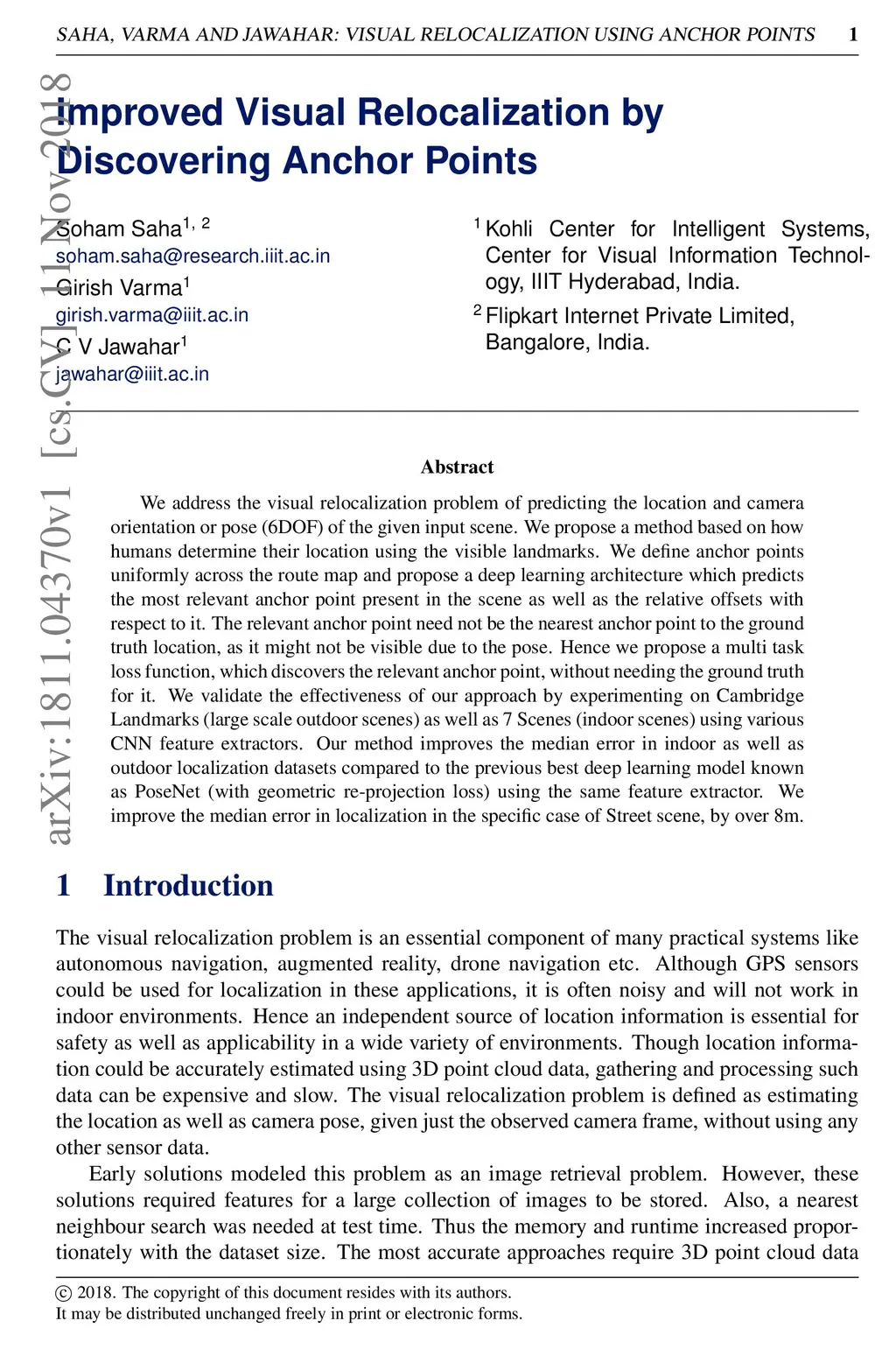 We address the visual relocalization problem of predicting the location and camera orientation or pose (6DOF) of the given input scene. We propose a method based on how humans determine their location using the visible landmarks. We define anchor points uniformly across the route map and propose a deep learning architecture which predicts the most relevant anchor point present in the scene as well as the relative offsets with respect to it. The relevant anchor point need not be the nearest anchor point to the ground truth location, as it might not be visible due to the pose. Hence we propose a multi task loss function, which discovers the relevant anchor point, without needing the ground truth for it. We validate the effectiveness of our approach by experimenting on CambridgeLandmarks (large scale outdoor scenes) as well as 7 Scenes (indoor scenes) using variousCNN feature extractors. Our method improves the median error in indoor as well as outdoor localization datasets compared to the previous best deep learning model known as PoseNet (with geometric re-projection loss) using the same feature extractor. We improve the median error in localization in the specific case of Street scene, by over 8m.