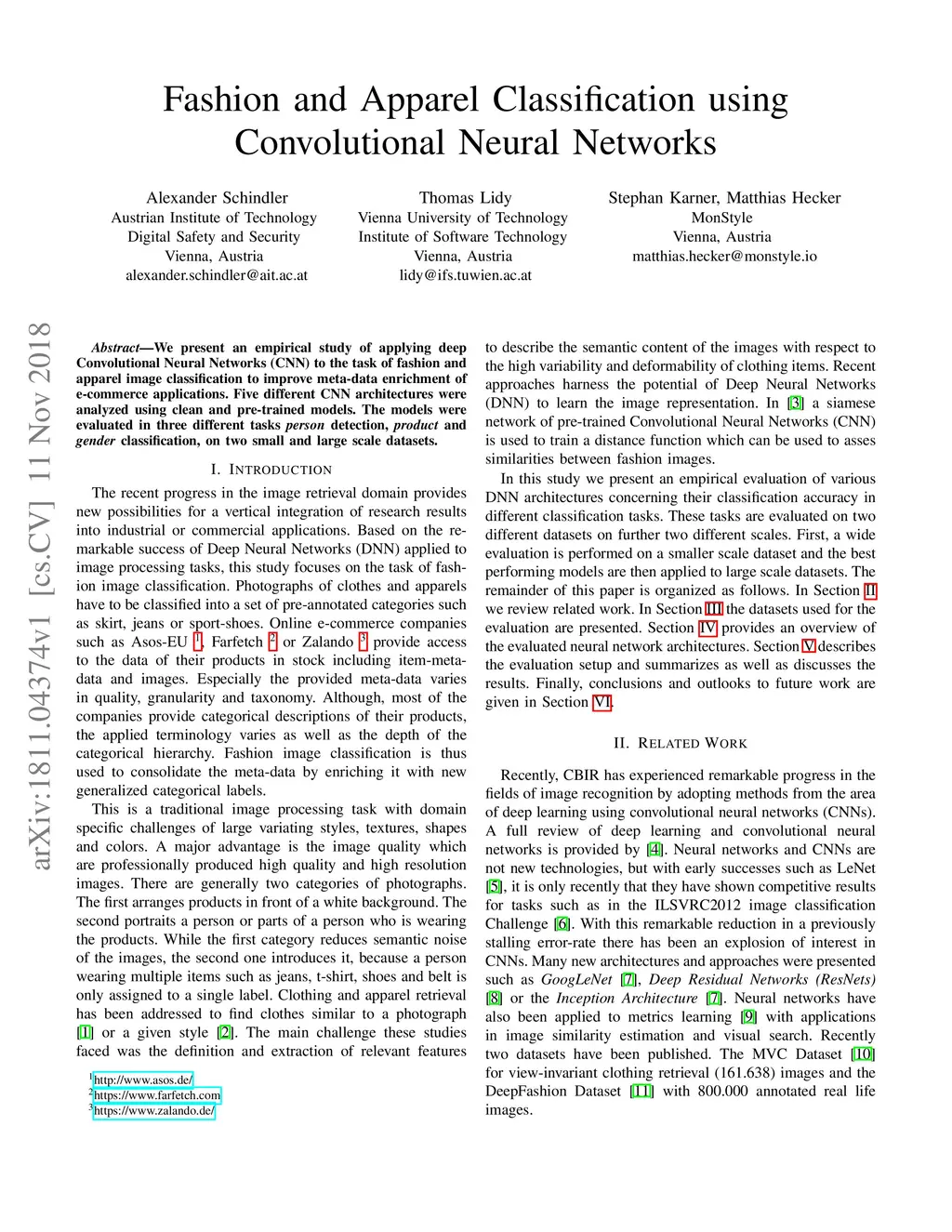 We present an empirical study of applying deep Convolutional Neural Networks (CNN) to the task of fashion and apparel image classification to improve meta-data enrichment of e-commerce applications. Five different CNN architectures were analyzed using clean and pre-trained models. The models were evaluated in three different tasks person detection, product and gender classification, on two small and large scale datasets.