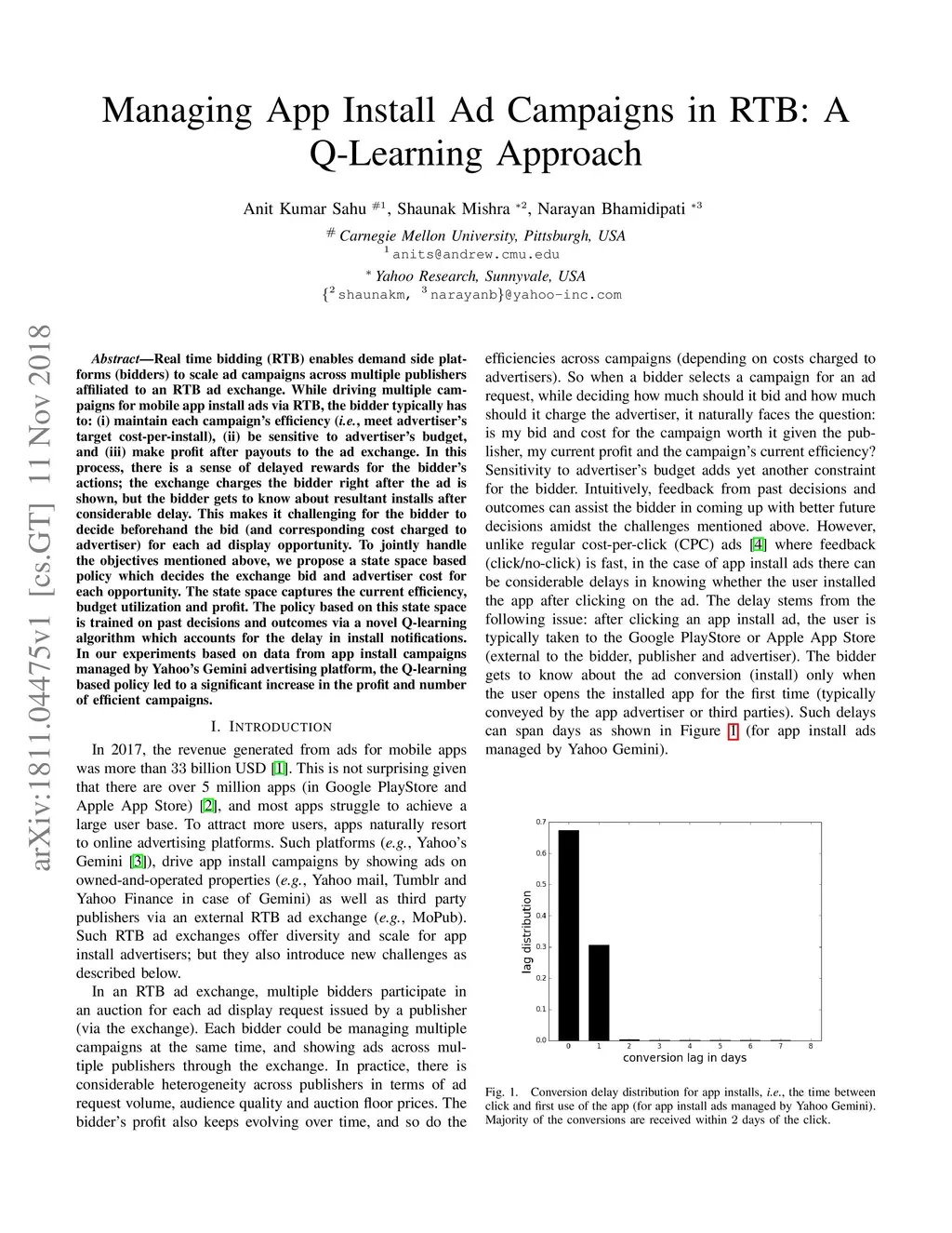 Real time bidding (RTB) enables demand side platforms (bidders) to scale ad campaigns across multiple publishers affiliated to an RTB ad exchange. While driving multiple campaigns for mobile app install ads via RTB, the bidder typically has to: (i) maintain each campaign's efficiency (i.e., meet advertiser's target cost-per-install), (ii) be sensitive to advertiser's budget, and (iii) make profit after payouts to the ad exchange. In this process, there is a sense of delayed rewards for the bidder's actions; the exchange charges the bidder right after the ad is shown, but the bidder gets to know about resultant installs after considerable delay. This makes it challenging for the bidder to decide beforehand the bid (and corresponding cost charged to advertiser) for each ad display opportunity. To jointly handle the objectives mentioned above, we propose a state space based policy which decides the exchange bid and advertiser cost for each opportunity. The state space captures the current efficiency, budget utilization and profit. The policy based on this state space is trained on past decisions and outcomes via a novel Q-learning algorithm which accounts for the delay in install notifications. In our experiments based on data from app install campaigns managed by Yahoo's Gemini advertising platform, the Q-learning based policy led to a significant increase in the profit and number of efficient campaigns.