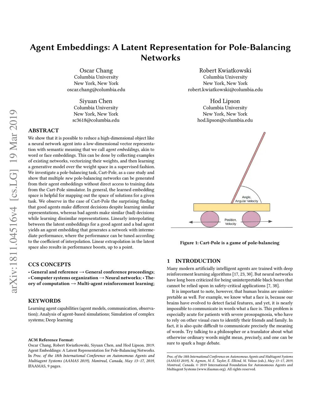 Agent Embeddings: A Latent Representation for Pole-Balancing Networks
