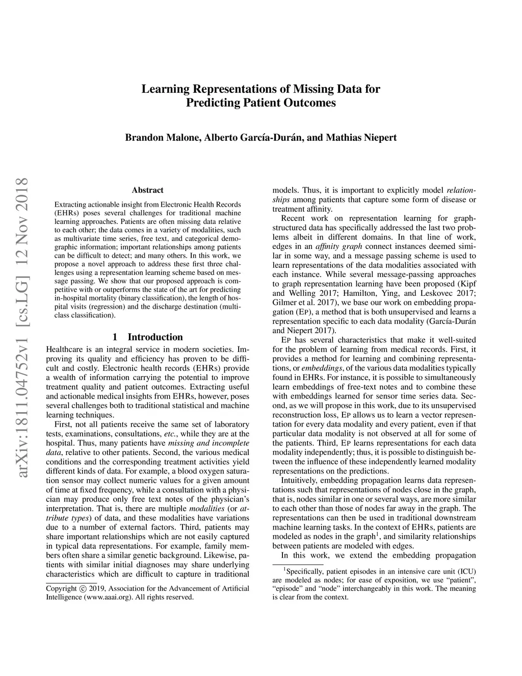 Extracting actionable insight from Electronic Health Records (EHRs) poses several challenges for traditional machine learning approaches. Patients are often missing data relative to each other; the data comes in a variety of modalities, such as multivariate time series, free text, and categorical demographic information; important relationships among patients can be difficult to detect; and many others. In this work, we propose a novel approach to address these first three challenges using a representation learning scheme based on message passing. We show that our proposed approach is competitive with or outperforms the state of the art for predicting in-hospital mortality (binary classification), the length of hospital visits (regression) and the discharge destination (multiclass classification).