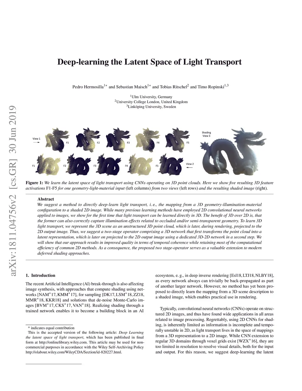 We suggest a method to directly deep-learn light transport, i. e., the mapping from a 3D geometry-illumination-material configuration to a shaded 2D image. While many previous learning methods have employed 2D convolutional neural networks applied to images, we show for the first time that light transport can be learned directly in 3D. The benefit of 3D over 2D is, that the former can also correctly capture illumination effects related to occluded and/or semi-transparent geometry. To learn 3D light transport, we represent the 3D scene as an unstructured 3D point cloud, which is later, during rendering, projected to the 2D output image. Thus, we suggest a two-stage operator comprising of a 3D network that first transforms the point cloud into a latent representation, which is later on projected to the 2D output image using a dedicated 3D-2D network in a second step. We will show that our approach results in improved quality in terms of temporal coherence while retaining most of the computational efficiency of common 2D methods. As a consequence, the proposed two stage-operator serves as a valuable extension to modern deferred shading approaches.