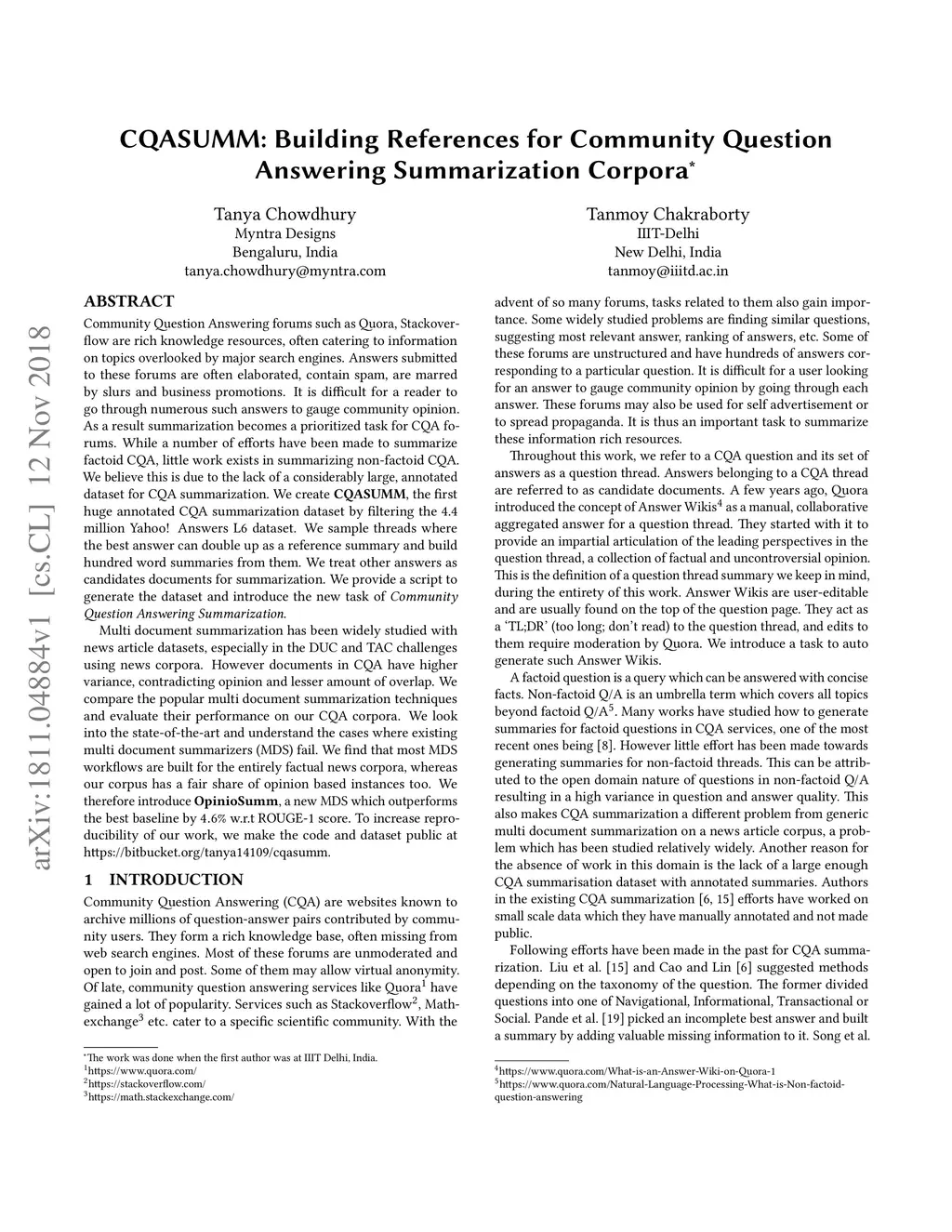 Community Question Answering forums such as Quora, Stackoverflow are rich knowledge resources, often catering to information on topics overlooked by major search engines. Answers submitted to these forums are often elaborated, contain spam, are marred by slurs and business promotions. It is difficult for a reader to go through numerous such answers to gauge community opinion. As a result summarization becomes a prioritized task for CQA forums. While a number of efforts have been made to summarize factoid CQA, little work exists in summarizing non-factoid CQA. We believe this is due to the lack of a considerably large, annotated dataset for CQA summarization. We create CQASUMM, the first huge annotated CQA summarization dataset by filtering the 4.4 million Yahoo! Answers L6 dataset. We sample threads where the best answer can double up as a reference summary and build hundred word summaries from them. We treat other answers as candidates documents for summarization. We provide a script to generate the dataset and introduce the new task of Community Question Answering Summarization. Multi document summarization has been widely studied with news article datasets, especially in the DUC and TAC challenges using news corpora. However documents in CQA have higher variance, contradicting opinion and lesser amount of overlap. We compare the popular multi document summarization techniques and evaluate their performance on our CQA corpora. We look into the state-of-the-art and understand the cases where existing multi document summarizers (MDS) fail. We find that most MDS workflows are built for the entirely factual news corpora, whereas our corpus has a fair share of opinion based instances too. We therefore introduce OpinioSumm, a new MDS which outperforms the best baseline by 4.6% w.r.t ROUGE-1 score.