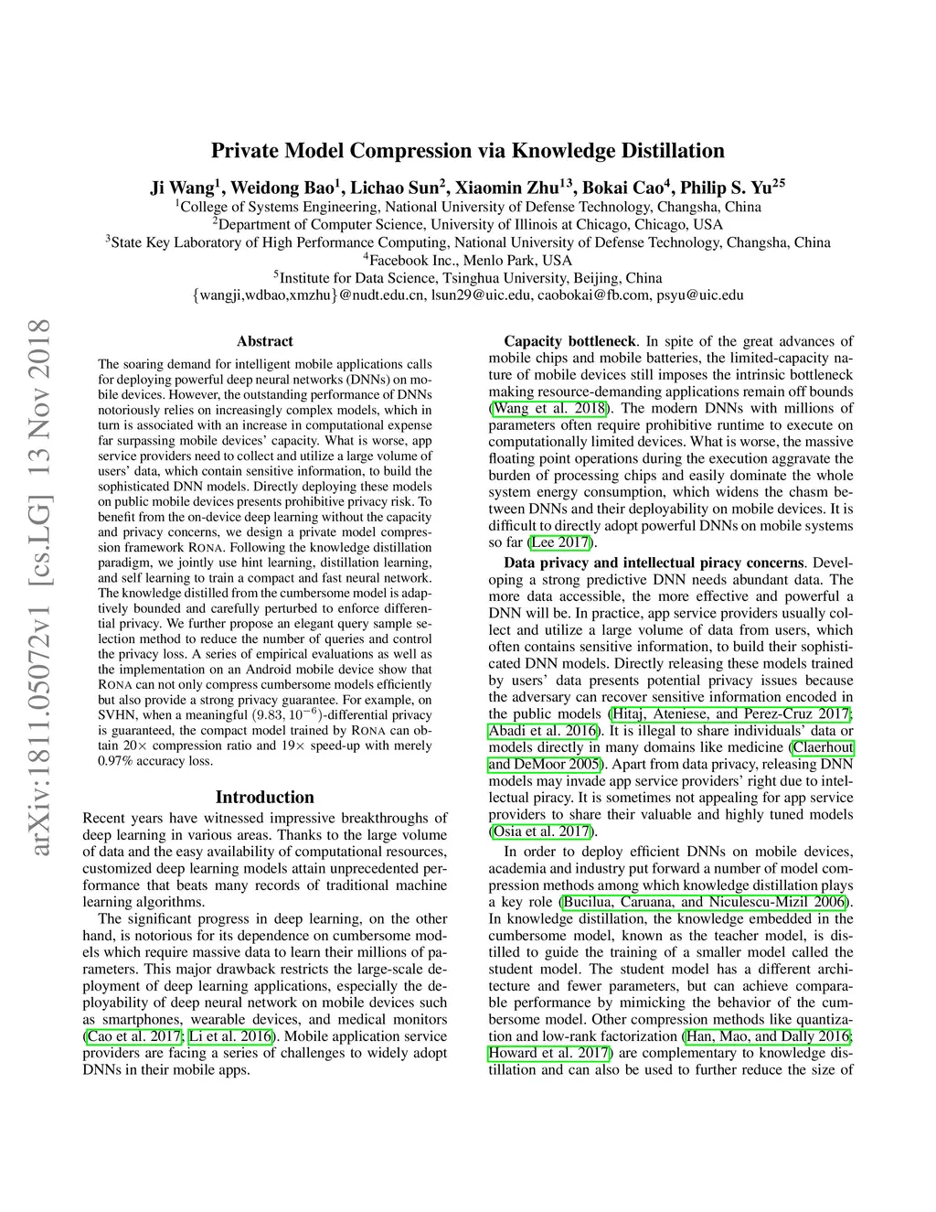 The soaring demand for intelligent mobile applications calls for deploying powerful deep neural networks (DNNs) on mobile devices. However, the outstanding performance of DNNs notoriously relies on increasingly complex models, which in turn is associated with an increase in computational expense far surpassing mobile devices' capacity. What is worse, app service providers need to collect and utilize a large volume of users' data, which contain sensitive information, to build the sophisticated DNN models. Directly deploying these models on public mobile devices presents prohibitive privacy risk. To benefit from the on-device deep learning without the capacity and privacy concerns, we design a private model compression framework RONA. Following the knowledge distillation paradigm, we jointly use hint learning, distillation learning, and self learning to train a compact and fast neural network. The knowledge distilled from the cumbersome model is adaptively bounded and carefully perturbed to enforce differential privacy. We further propose an elegant query sample selection method to reduce the number of queries and control the privacy loss. A series of empirical evaluations as well as the implementation on an Android mobile device show that RONA can not only compress cumbersome models efficiently but also provide a strong privacy guarantee. For example, on SVHN, when a meaningful -differential privacy is guaranteed, the compact model trained by RONA can obtain 20 compression ratio and 19 speed-up with merely 0.97% accuracy loss.