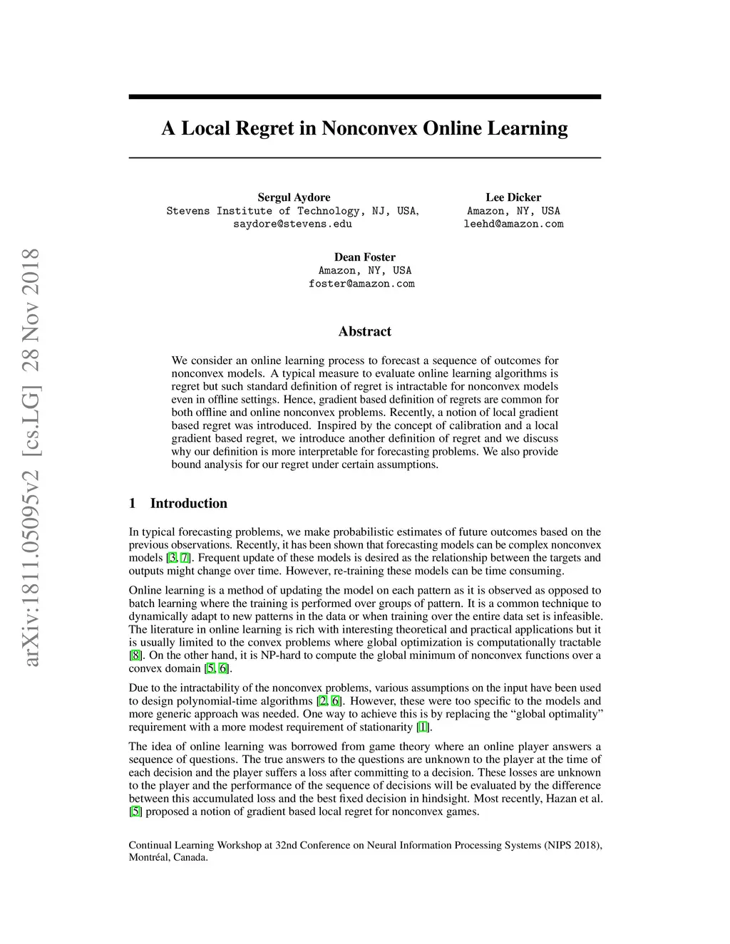 We consider an online learning process to forecast a sequence of outcomes for nonconvex models. A typical measure to evaluate online learning algorithms is regret but such standard definition of regret is intractable for nonconvex models even in offline settings. Hence, gradient based definition of regrets are common for both offline and online nonconvex problems. Recently, a notion of local gradient based regret was introduced. Inspired by the concept of calibration and a local gradient based regret, we introduce another definition of regret and we discuss why our definition is more interpretable for forecasting problems. We also provide bound analysis for our regret under certain assumptions.