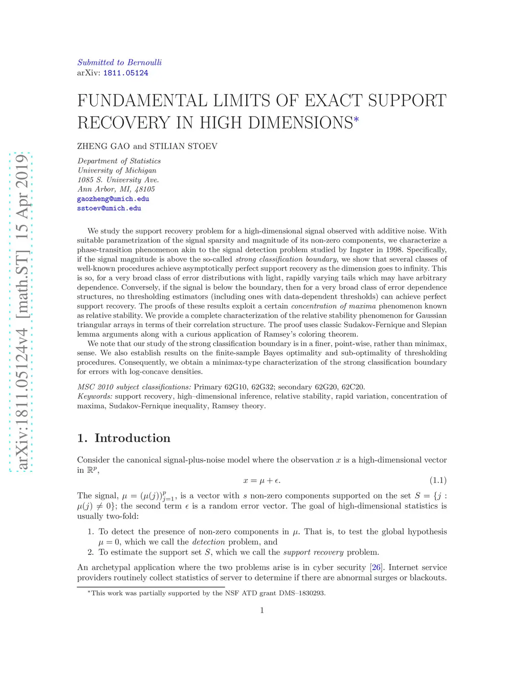 We study the support recovery problem for a high-dimensional signal observed with additive noise. With suitable parametrization of the signal sparsity and magnitude of its non-zero components, we characterize a phase-transition phenomenon akin to the signal detection problem studied by Ingster in 1998. Specifically, if the signal magnitude is above the so-called strong classification boundary, we show that several classes of well-known procedures achieve asymptotically perfect support recovery as the dimension goes to infinity. This is so, for a very broad class of error distributions with light, rapidly varying tails which may have arbitrary dependence. Conversely, if the signal is below the boundary, then for a very broad class of error dependence structures, no thresholding estimators (including ones with data-dependent thresholds) can achieve perfect support recovery. The proofs of these results exploit a certain concentration of maxima phenomenon known as relative stability. We provide a complete characterization of the relative stability phenomenon for Gaussian triangular arrays in terms their correlation structure. The proof uses classic Sudakov-Fernique and Slepian lemma arguments along with a curious application of Ramsey's coloring theorem. We note that our study of the strong classification boundary is in a finer, point-wise, rather than minimax, sense. We also establish the Bayes optimality and sub-optimality of thresholding procedures. Consequently, we obtain a minimax-type characterization of the strong classification boundary for errors with log-concave densities.