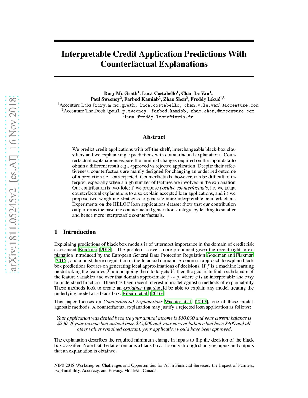 We predict credit applications with off-the-shelf, interchangeable black-box classifiers and we explain single predictions with counterfactual explanations. Counterfactual explanations expose the minimal changes required on the input data to obtain a different result e.g., approved vs rejected application. Despite their effectiveness, counterfactuals are mainly designed for changing an undesired outcome of a prediction i.e. loan rejected. Counterfactuals, however, can be difficult to interpret, especially when a high number of features are involved in the explanation. Our contribution is two-fold: i) we propose positive counterfactuals, i.e. we adapt counterfactual explanations to also explain accepted loan applications, and ii) we propose two weighting strategies to generate more interpretable counterfactuals. Experiments on the HELOC loan applications dataset show that our contribution outperforms the baseline counterfactual generation strategy, by leading to smaller and hence more interpretable counterfactuals.