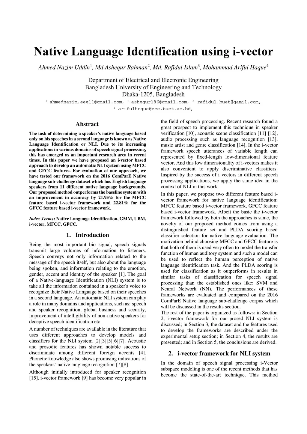 The task of determining a speaker's native language based only on his speeches in a second language is known as Native Language Identification or NLI. Due to its increasing applications in various domains of speech signal processing, this has emerged as an important research area in recent times. In this paper we have proposed an i-vector based approach to develop an automatic NLI system using MFCC and GFCC features. For evaluation of our approach, we have tested our framework on the 2016 ComParE Native language sub-challenge dataset which has English language speakers from 11 different native language backgrounds. Our proposed method outperforms the baseline system with an improvement in accuracy by 21.95% for the MFCC feature based i-vector framework and 22.81% for the GFCC feature based i-vector framework.