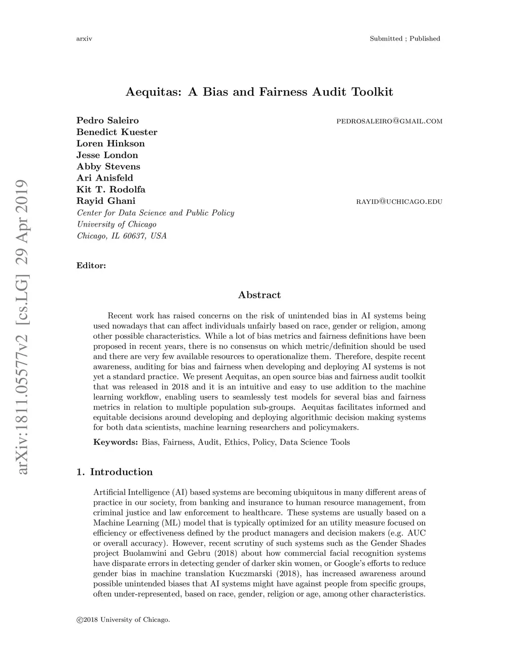 Recent work has raised concerns on the risk of unintended bias in AI systems being used nowadays that can affect individuals unfairly based on race, gender or religion, among other possible characteristics. While a lot of bias metrics and fairness definitions have been proposed in recent years, there is no consensus on which metric/definition should be used and there are very few available resources to operationalize them. Therefore, despite recent awareness, auditing for bias and fairness when developing and deploying AI systems is not yet a standard practice. We present Aequitas, an open source bias and fairness audit toolkit that is an intuitive and easy to use addition to the machine learning workflow, enabling users to seamlessly test models for several bias and fairness metrics in relation to multiple population sub-groups. Aequitas facilitates informed and equitable decisions around developing and deploying algorithmic decision making systems for both data scientists, machine learning researchers and policymakers.