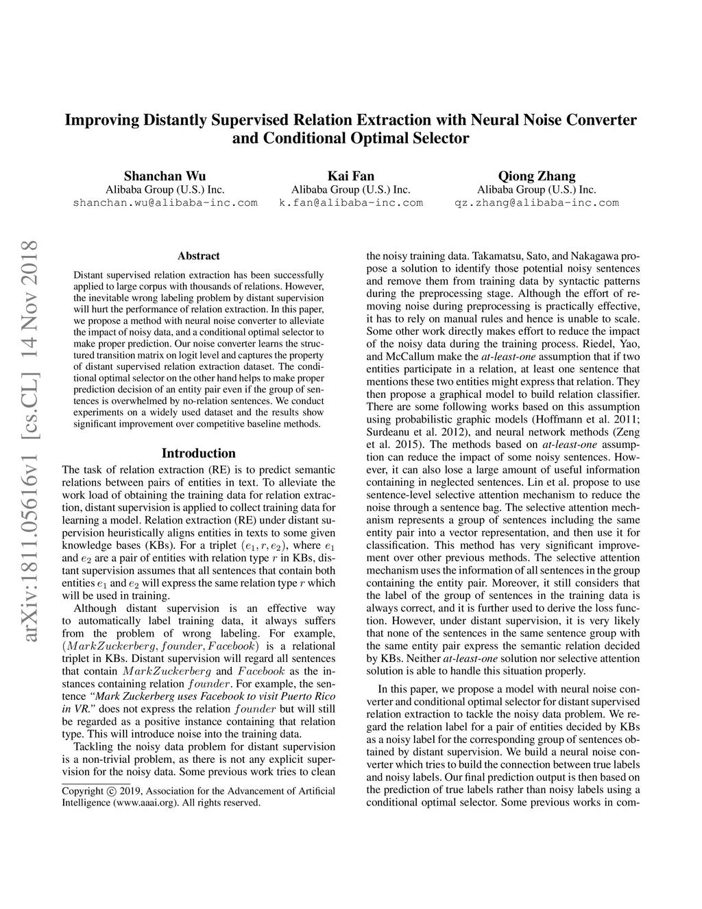 Distant supervised relation extraction has been successfully applied to large corpus with thousands of relations. However, the inevitable wrong labeling problem by distant supervision will hurt the performance of relation extraction. In this paper, we propose a method with neural noise converter to alleviate the impact of noisy data, and a conditional optimal selector to make proper prediction. Our noise converter learns the structured transition matrix on logit level and captures the property of distant supervised relation extraction dataset. The conditional optimal selector on the other hand helps to make proper prediction decision of an entity pair even if the group of sentences is overwhelmed by no-relation sentences. We conduct experiments on a widely used dataset and the results show significant improvement over competitive baseline methods.