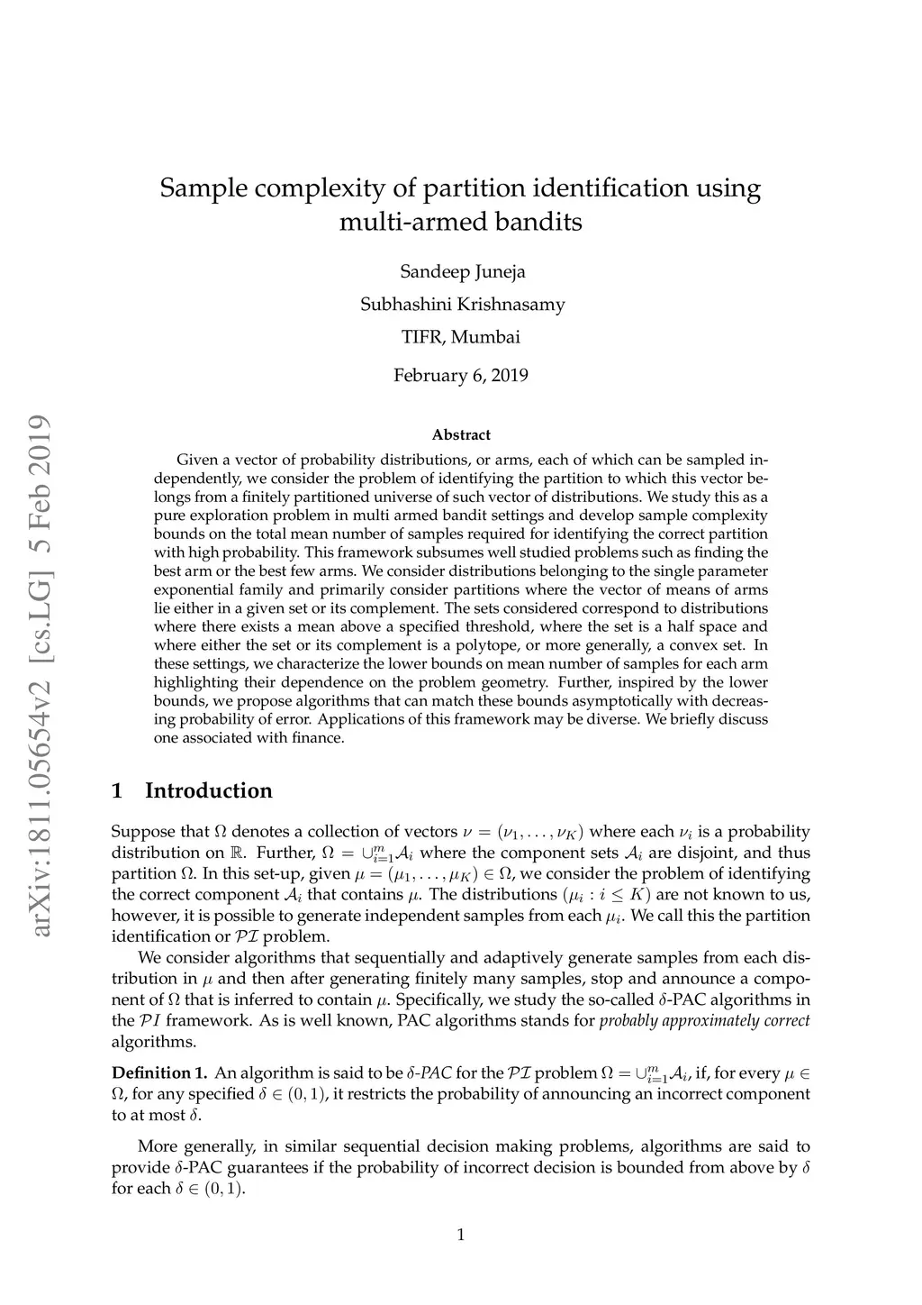 Given a vector of probability distributions, or arms, each of which can be sampled independently, we consider the problem of identifying the partition to which this vector belongs from a finitely partitioned universe of such vector of distributions. We study this as a pure exploration problem in multi armed bandit settings and develop sample complexity bounds on the total mean number of samples required for identifying the correct partition with high probability. This framework subsumes well studied problems such as finding the best arm or the best few arms. We consider distributions belonging to the single parameter exponential family and primarily consider partitions where the vector of means of arms lie either in a given set or its complement. The sets considered correspond to distributions where there exists a mean above a specified threshold, where the set is a half space and where either the set or its complement is a polytope, or more generally, a convex set. In these settings, we characterize the lower bounds on mean number of samples for each arm highlighting their dependence on the problem geometry. Further, inspired by the lower bounds, we propose algorithms that can match these bounds asymptotically with decreasing probability of error. Applications of this framework may be diverse. We briefly discuss one associated with finance.