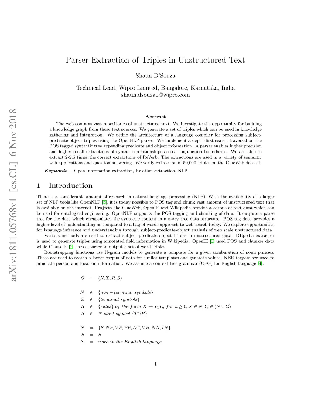 The web contains vast repositories of unstructured text. We investigate the opportunity for building a knowledge graph from these text sources. We generate a set of triples which can be used in knowledge gathering and integration. We define the architecture of a language compiler for processing subject-predicate-object triples using the OpenNLP parser. We implement a depth-first search traversal on the POS tagged syntactic tree appending predicate and object information. A parser enables higher precision and higher recall extractions of syntactic relationships across conjunction boundaries. We are able to extract 2-2.5 times the correct extractions of ReVerb. The extractions are used in a variety of semantic web applications and question answering. We verify extraction of 50,000 triples on the ClueWeb dataset.
