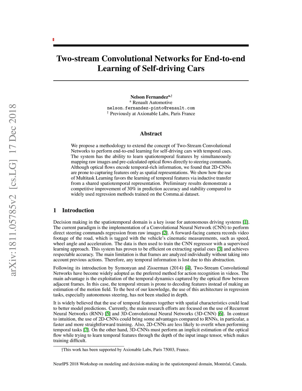 We propose a methodology to extend the concept of Two-Stream Convolutional Networks to perform end-to-end learning for self-driving cars with temporal cues. The system has the ability to learn spatiotemporal features by simultaneously mapping raw images and pre-calculated optical flows directly to steering commands. Although optical flows encode temporal-rich information, we found that 2D-CNNs are prone to capturing features only as spatial representations. We show how the use of Multitask Learning favors the learning of temporal features via inductive transfer from a shared spatiotemporal representation. Preliminary results demonstrate a competitive improvement of 30% in prediction accuracy and stability compared to widely used regression methods trained on the Comma.ai dataset.