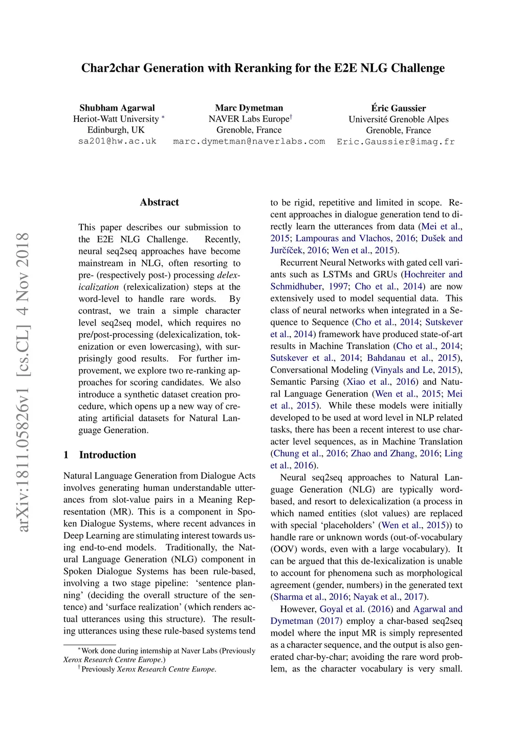 Char2char Generation with Reranking for the E2E NLG Challenge