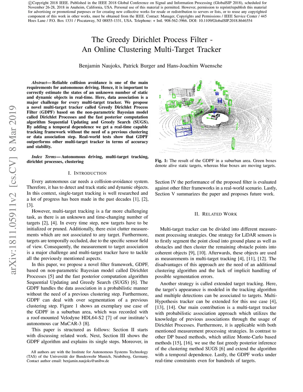 Reliable collision avoidance is one of the main requirements for autonomous driving. Hence, it is important to correctly estimate the states of an unknown number of static and dynamic objects in real-time. Here, data association is a major challenge for every multi-target tracker. We propose a novel multi-target tracker called Greedy Dirichlet Process Filter (GDPF) based on the non-parametric Bayesian model called Dirichlet Processes and the fast posterior computation algorithm Sequential Updating and Greedy Search (SUGS). By adding a temporal dependence we get a real-time capable tracking framework without the need of a previous clustering or data association step. Real-world tests show that GDPF outperforms other multi-target tracker in terms of accuracy and stability.