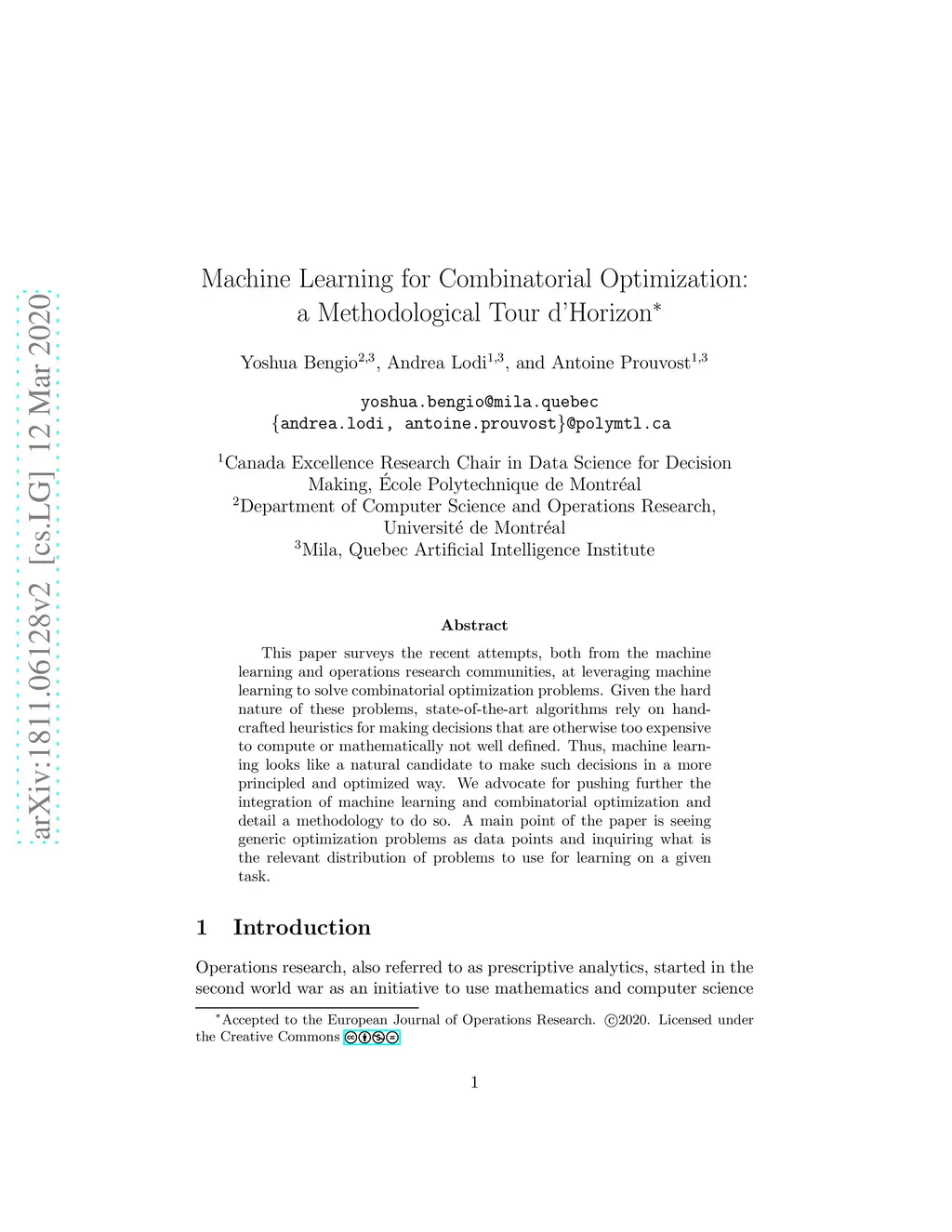 This paper surveys the recent attempts, both from the machine learning and operations research communities, at leveraging machine learning to solve combinatorial optimization problems. Given the hard nature of these problems, state-of-the-art algorithms rely on handcrafted heuristics for making decisions that are otherwise too expensive to compute or mathematically not well defined. Thus, machine learning looks like a natural candidate to make such decisions in a more principled and optimized way. We advocate for pushing further the integration of machine learning and combinatorial optimization and detail a methodology to do so. A main point of the paper is seeing generic optimization problems as data points and inquiring what is the relevant distribution of problems to use for learning on a given task.