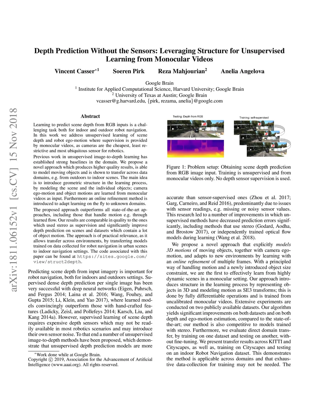 Learning to predict scene depth from RGB inputs is a challenging task both for indoor and outdoor robot navigation. In this work we address unsupervised learning of scene depth and robot ego-motion where supervision is provided by monocular videos, as cameras are the cheapest, least restrictive and most ubiquitous sensor for robotics. Previous work in unsupervised image-to-depth learning has established strong baselines in the domain. We propose a novel approach which produces higher quality results, is able to model moving objects and is shown to transfer across data domains, e.g. from outdoors to indoor scenes. The main idea is to introduce geometric structure in the learning process, by modeling the scene and the individual objects; camera ego-motion and object motions are learned from monocular videos as input. Furthermore an online refinement method is introduced to adapt learning on the fly to unknown domains. The proposed approach outperforms all state-of-the-art approaches, including those that handle motion e.g. through learned flow. Our results are comparable in quality to the ones which used stereo as supervision and significantly improve depth prediction on scenes and datasets which contain a lot of object motion. The approach is of practical relevance, as it allows transfer across environments, by transferring models trained on data collected for robot navigation in urban scenes to indoor navigation settings. The code associated with this paper can be found at https://sites.google.com/view/struct2depth.