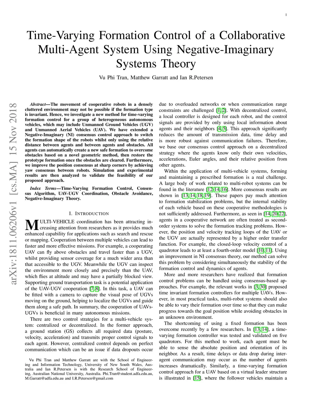 The movement of cooperative robots in a densely cluttered environment may not be possible if the formation type is invariant. Hence, we investigate a new method for time-varying formation control for a group of heterogeneous autonomous vehicles, which may include Unmanned Ground Vehicles (UGV) and Unmanned Aerial Vehicles (UAV). We have extended a Negative-Imaginary (NI) consensus control approach to switch the formation shape of the robots whilst only using the relative distance between agents and between agents and obstacles. All agents can automatically create a new safe formation to overcome obstacles based on a novel geometric method, then restore the prototype formation once the obstacles are cleared. Furthermore, we improve the position consensus at sharp corners by achieving yaw consensus between robots. Simulation and experimental results are then analyzed to validate the feasibility of our proposed approach.