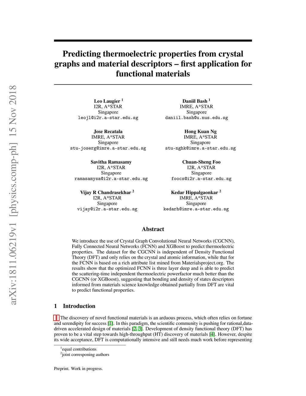 We introduce the use of Crystal Graph Convolutional Neural Networks (CGCNN), Fully Connected Neural Networks (FCNN) and XGBoost to predict thermoelectric properties. The dataset for the CGCNN is independent of Density Functional Theory (DFT) and only relies on the crystal and atomic information, while that for the FCNN is based on a rich attribute list mined from Materialsproject.org. The results show that the optimized FCNN is three layer deep and is able to predict the scattering-time independent thermoelectric powerfactor much better than the CGCNN (or XGBoost), suggesting that bonding and density of states descriptors informed from materials science knowledge obtained partially from DFT are vital to predict functional properties.