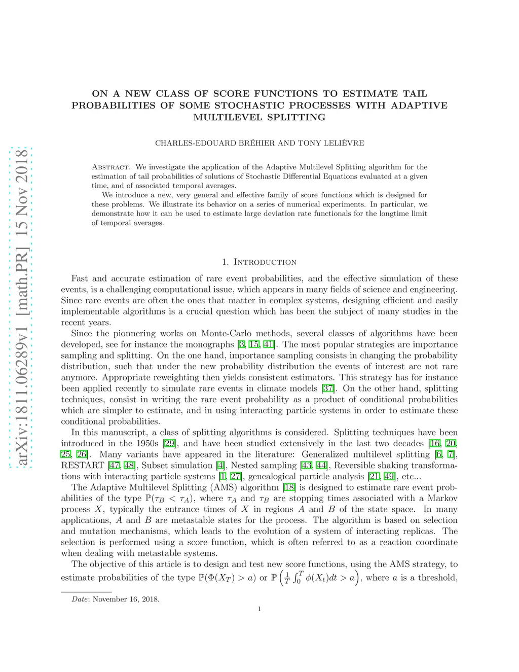 We investigate the application of the Adaptive Multilevel Splitting algorithm for the estimation of tail probabilities of solutions of Stochastic Differential Equations evaluated at a given time, and of associated temporal averages. We introduce a new, very general and effective family of score functions which is designed for these problems. We illustrate its behavior on a series of numerical experiments. In particular, we demonstrate how it can be used to estimate large deviation rate functionals for the longtime limit of temporal averages.
