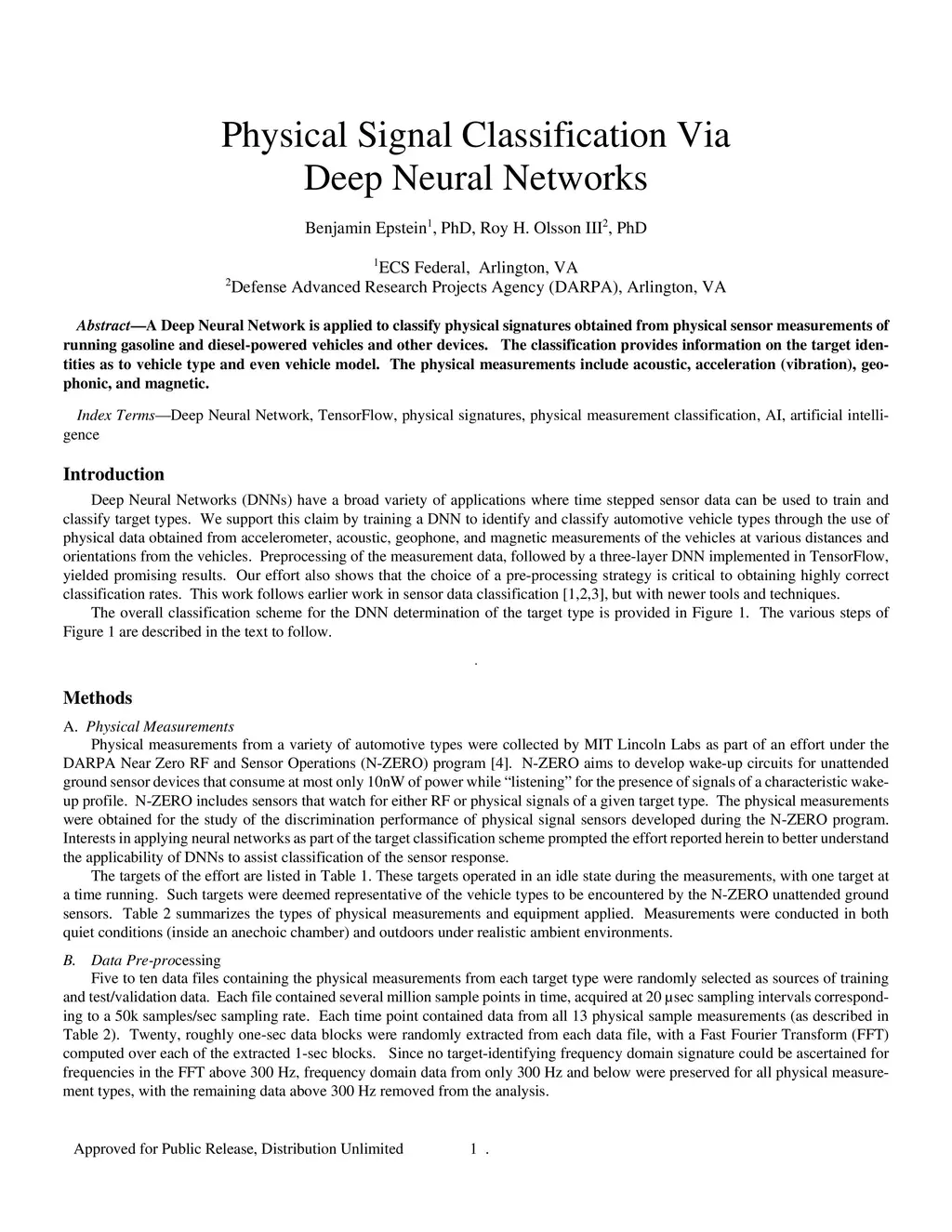 A Deep Neural Network is applied to classify physical signatures obtained from physical sensor measurements of running gasoline and diesel-powered vehicles and other devices. The classification provides information on the target identities as to vehicle type and even vehicle model. The physical measurements include acoustic, acceleration (vibration), geophonic, and magnetic.