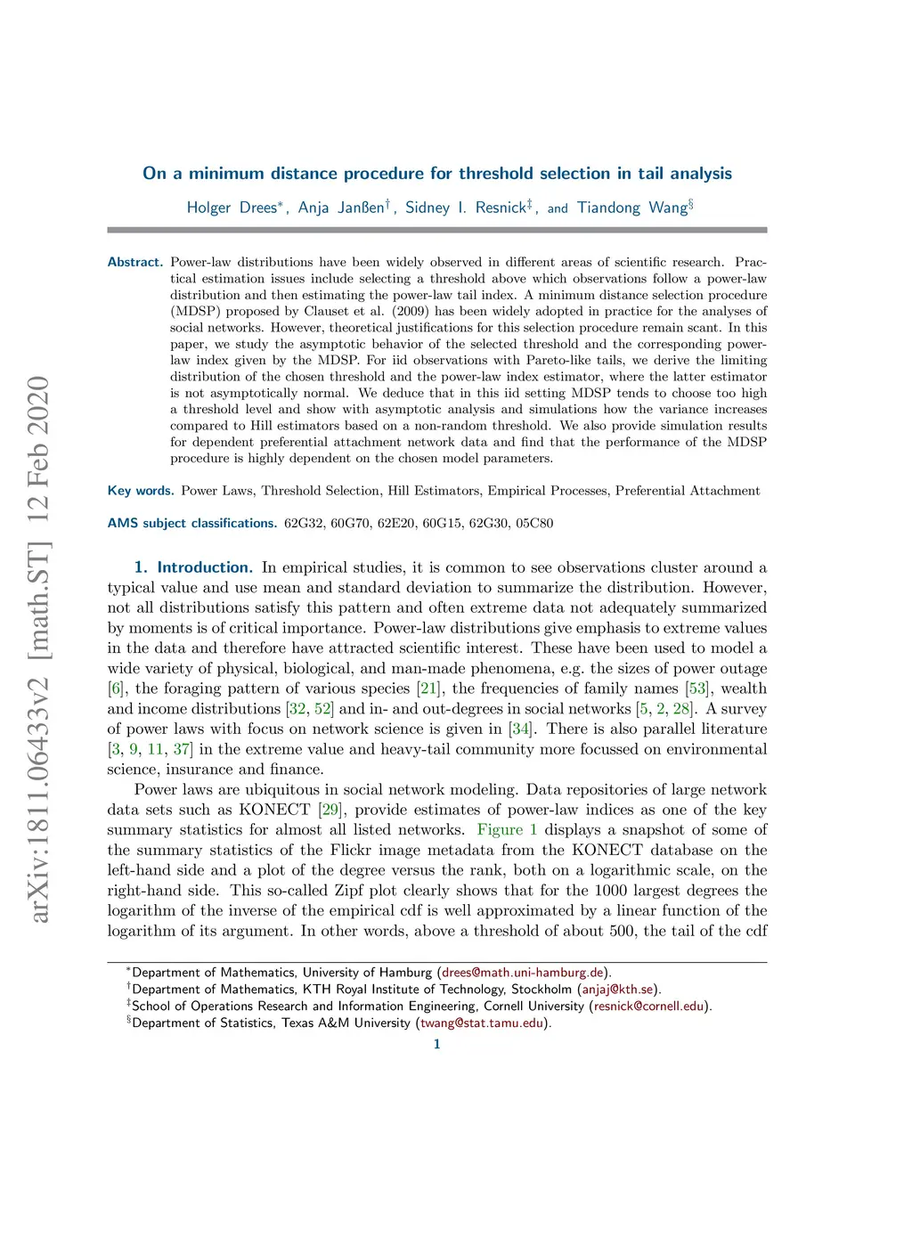 Power-law distributions have been widely observed in different areas of scientific research. Practical estimation issues include how to select a threshold above which observations follow a power-law distribution and then how to estimate the power-law tail index. A minimum distance selection procedure (MDSP) is proposed in Clauset et al. (2009) and has been widely adopted in practice, especially in the analyses of social networks. However, theoretical justifications for this selection procedure remain scant. In this paper, we study the asymptotic behavior of the selected threshold and the corresponding power-law index given by the MDSP. We find that the MDSP tends to choose too high a threshold level and leads to Hill estimates with large variances and root mean squared errors for simulated data with Pareto-like tails.